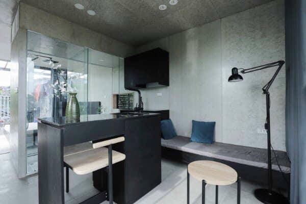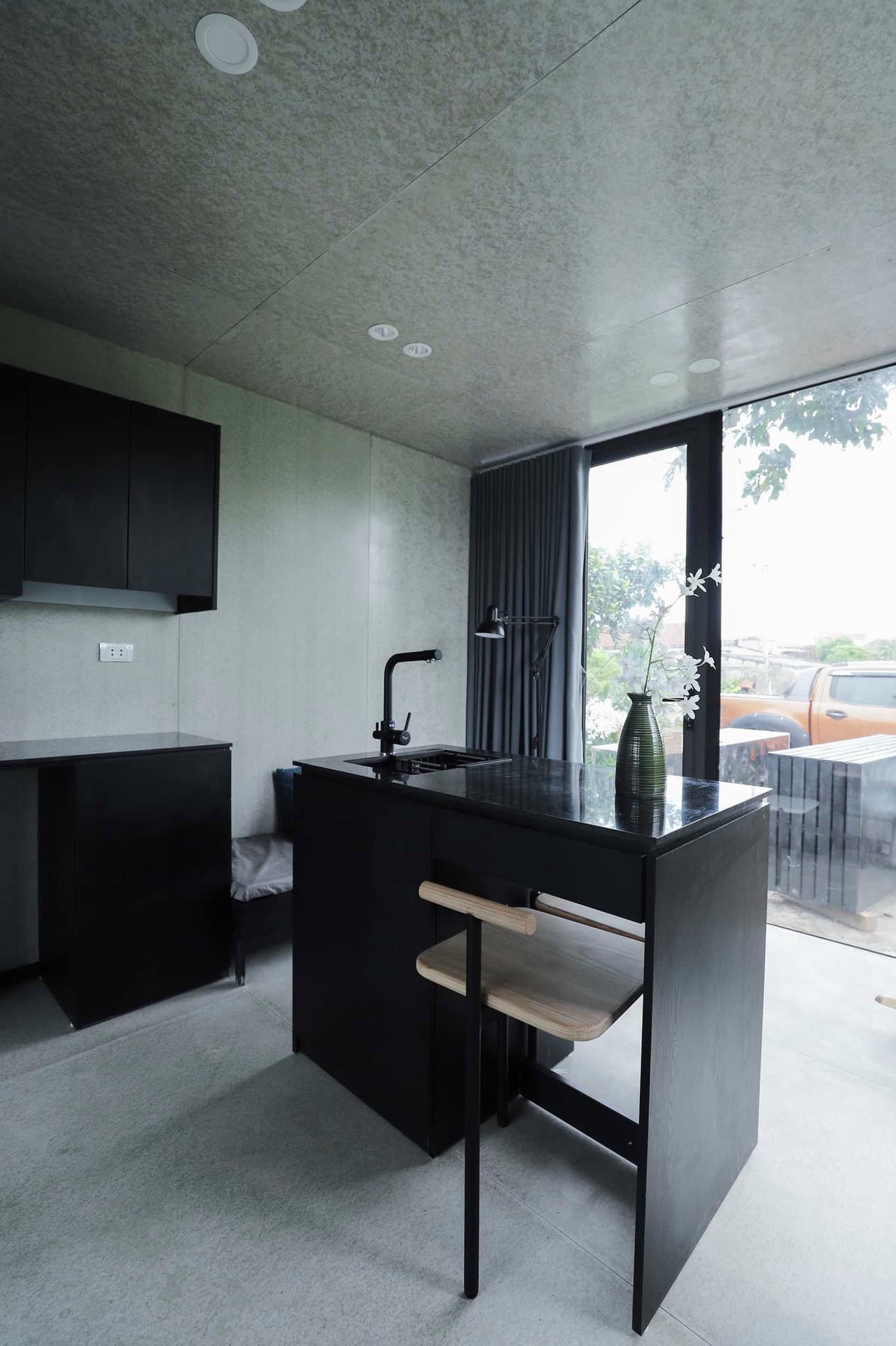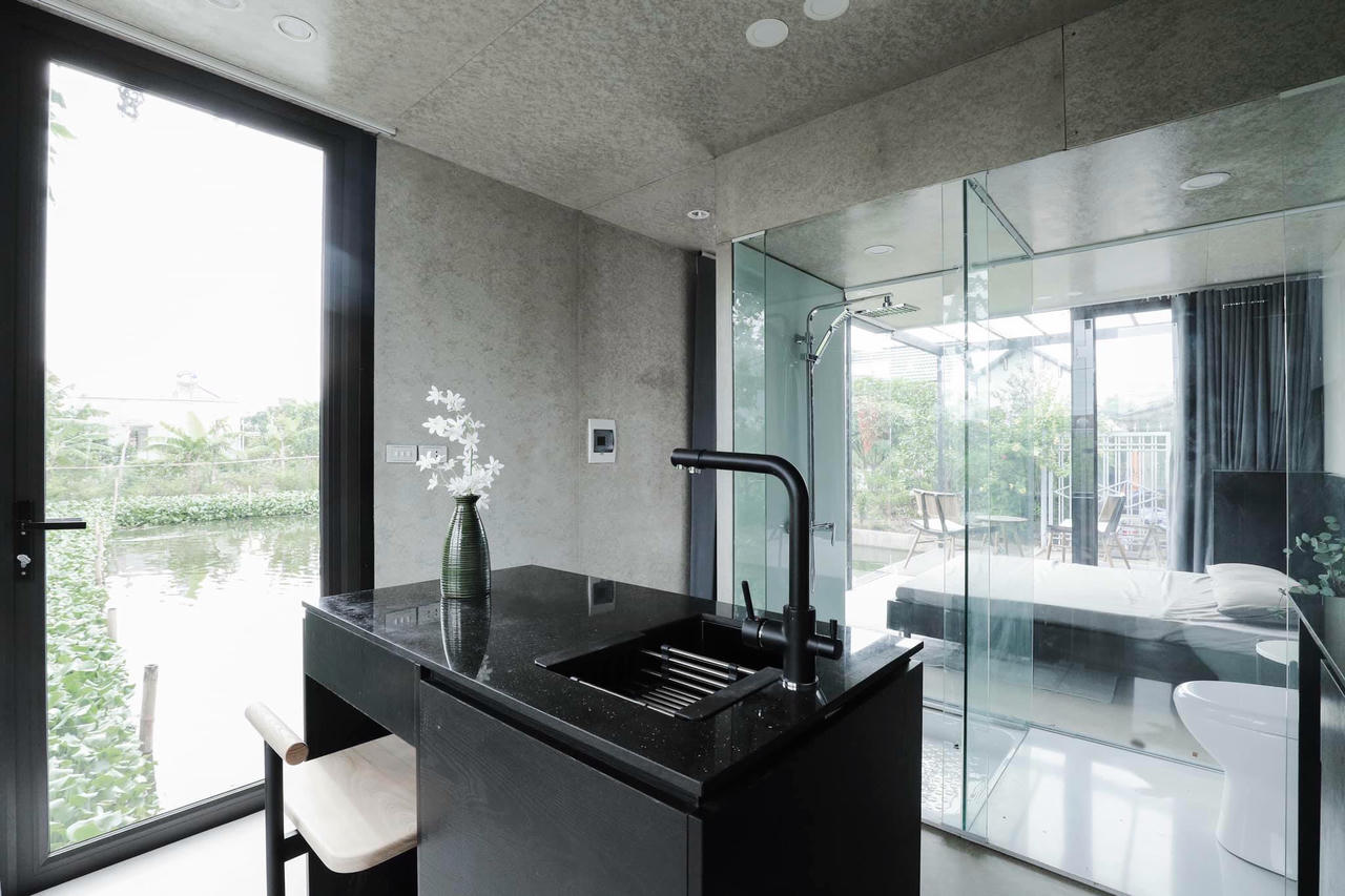 Modun nhà này diện tích nhỏ, nên được bố trí bàn bar kết hợp bồn rửa mini, nhưng vẫn đủ công năng để nấu nướng. |