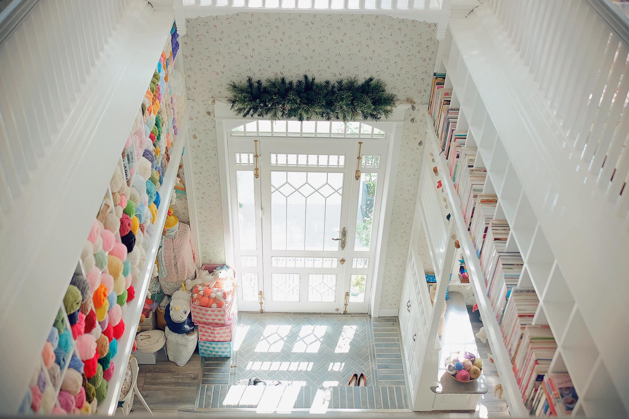 Lối cầu thang đi lên tầng trên cũng được lắp ráp một chiếc tủ đựng đầy len sợi. |