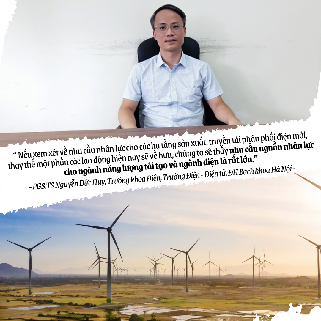 Với viễn cảnh này, PGS.TS Nguyễn Đức Huy, Trưởng khoa Điện, Trường Điện - Điện tử, Đại học Bách khoa Hà Nội, đánh giá: Nếu xem xét về nhu cầu nhân lực cho các hạ tầng sản xuất, truyền tải phân phối điện mới, thay thế một phần các lao động hiện nay sẽ về hưu, chúng ta sẽ thấy nhu cầu nguồn nhân lực cho ngành NLTT và ngành điện là rất lớn. Đó là chưa kể đến các sự dịch chuyển chuỗi cung ứng, khi Việt Nam có thể sẽ phát triển các hạ tầng về sản xuất, phân phối hydrogen, cũng là những ngành công nghiệp có mối liên hệ chặt chẽ với ngành điện và NLTT.