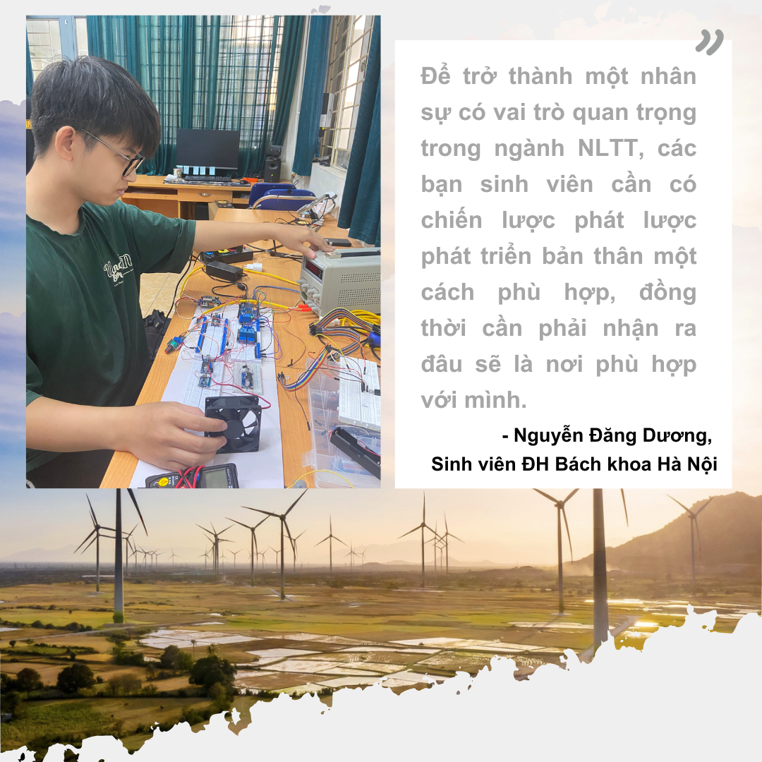 “Việc làm trong ngành NLTT là cực kỳ đa dạng và phong phú, nhất là trong giai đoạn Việt Nam và thế giới đẩy mạnh phát triển NLTT thay thế cho các nguồn năng lượng truyền thống, nhằm đảm bảo an ninh năng lượng và ứng phó với những vấn đề về biến đổi khí hậu", Nguyễn Đăng Dương, sinh viên năm thứ 5 ngành kỹ thuật điện, Trường Điện - Điện tử, Đại học Bách khoa Hà Nội, chia sẻ.