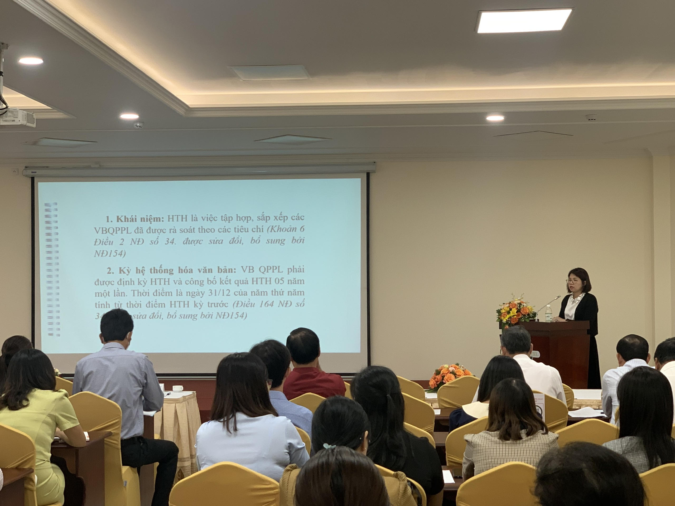 Tại Hội nghị, Cục Phó Cục trưởng Cục Kiểm tra văn bản QPPL Hoàng Xuân Hoan đã cung cấp những kiến thức cơ bản liên quan đến hệ thống hóa văn bản QPPL như: Cơ sở pháp lý, các văn bản chỉ đạo, hướng dẫn thực hiện Chính phủ, Bộ Tư pháp…; giới thiệu điểm mới của Luật Ban hành văn bản QPPL 2015 (Điều 170), Nghị định số 34/2016/NĐ-CP ngày 14/5/2016 của Chính phủ quy định chi tiết một số điều và biện pháp thi hành Luật Ban hành văn bản QPPL.