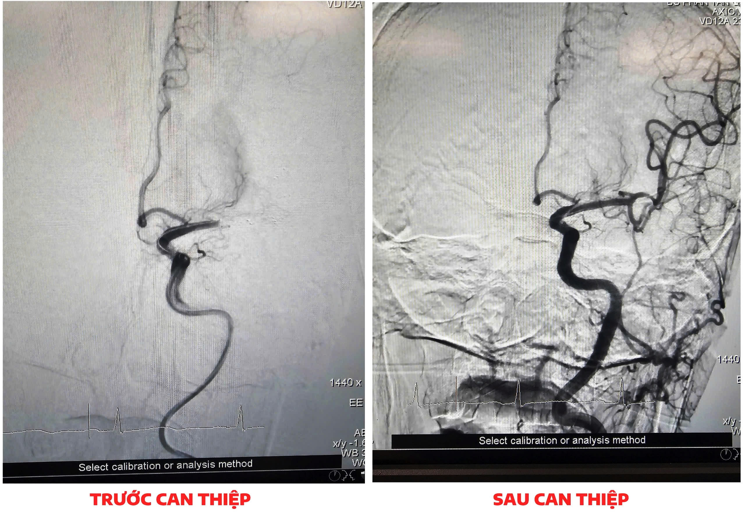 Hình ảnh động mạch não người bệnh tắc hoàn toàn nhánh M1 động mạch não giữa bên trái và sau can thiệp tái thông hoàn toàn nhánh M1. |