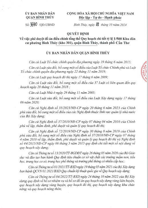 Quyết định số 3690/QĐ-UBND của UBND quận Bình Thủy về việc điều chỉnh tổng thể Quy hoạch chi tiết tỷ lệ 1/500 Khu dân cư phường Bình Thủy. |