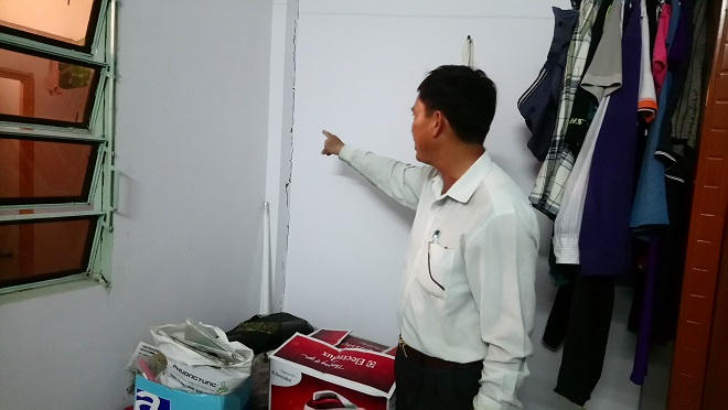 Trình bày về nguyên nhân nhà bị nứt, ông Chinh nói, “Khu đất bên cạnh thuộc quản lý của Công ty công trình giao thông thủy lợi - Tổng công ty 622 Bộ Quốc phòng cho công ty Phan Thông thuê lại làm bãi tập kết cát đá trộn bê tông; mỗi khi máy trộn bê tông vận hành thì nhà cửa của người dân bị rung lắc, gây nứt”.