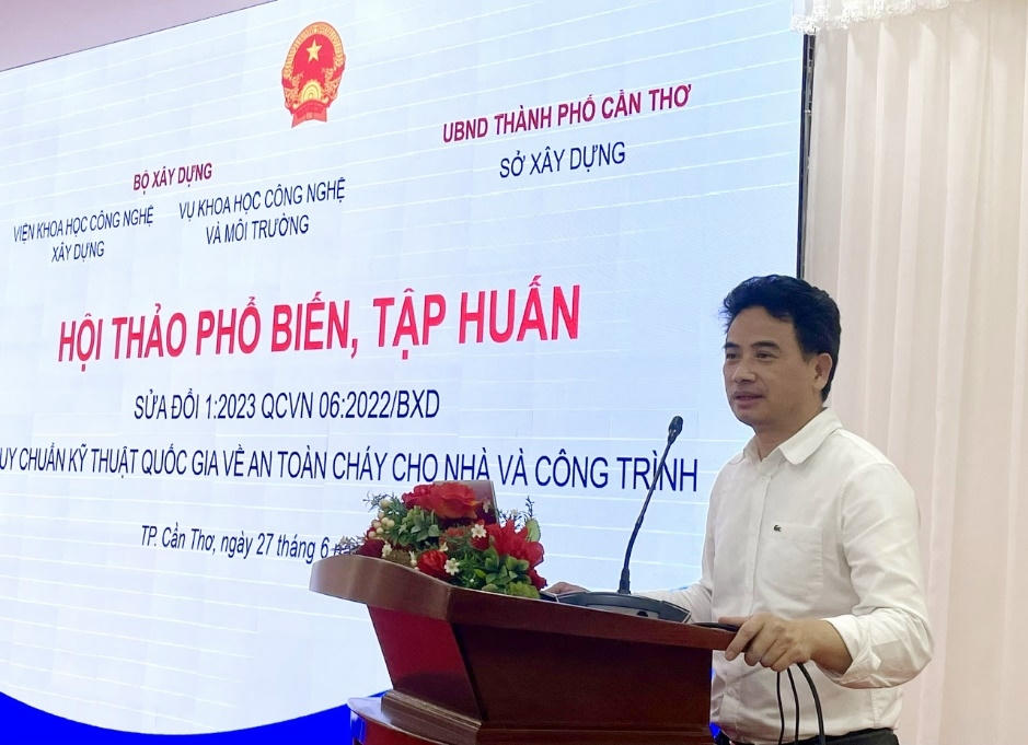 Thực hiện chỉ đạo của Thủ tướng Chính phủ theo Chỉ thị số 19/CT-TTg ngày 24/6/2024, ngày 27/6, tại thành phố Cần Thơ, Vụ Khoa học công nghệ và Môi trường (Bộ Xây dựng) cùng Viện Khoa học Công nghệ xây dựng (Bộ Xây dựng) phối hợp với Sở Xây dựng Cần Thơ đã tổ chức Hội thảo tập huấn, phổ biến Thông tư 09/2023/TT-BXD ban hành Sửa đổi 1:2023 QCVN 06:2022/BXD Quy chuẩn kỹ thuật quốc gia về an toàn cháy cho nhà và công trình.
