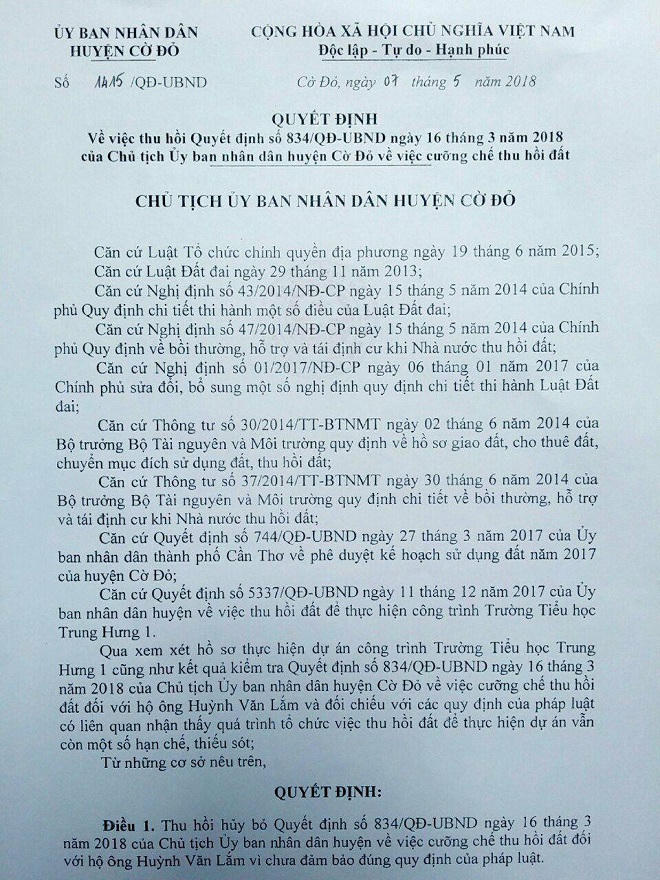 Theo đó, ngày 16/3/2018, ông Bùi Văn Kiệt – Phó chủ tịch UBND huyện Cờ Đỏ đã ký 5 quyết định cưỡng chế thu hồi đất của các hộ Huỳnh Văn Lắm, Huỳnh Văn Chờ, Nguyễn Thành Nam, Nguyễn Thị Kim Thanh, Nguyễn Thị Việt Thúy. Phần đất bị thu hồi này để thực hiện dự án mở rộng, nâng cấp Trường Tiểu học Trung Hưng 1.