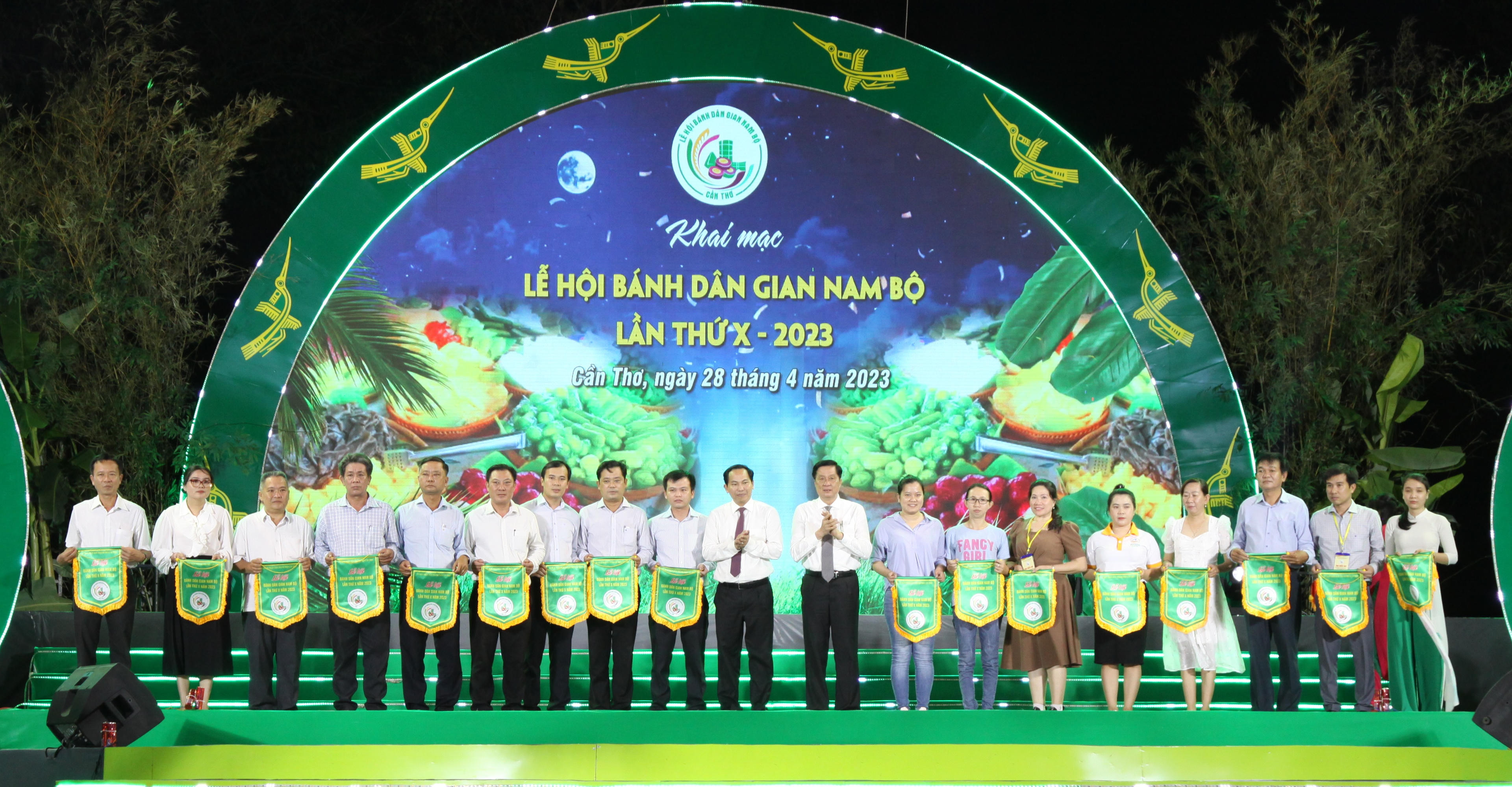 Ông Lê Quang Mạnh - Bí thư TP Cần Thơ và ông Phạm Văn Hiểu Chủ tịch HĐND TP Cần Thơ (áo trắng, giữa) trao cờ lưu niệm cho các đơn vị tham gia hội bánh - Ảnh Nguyễn Thuận. |
