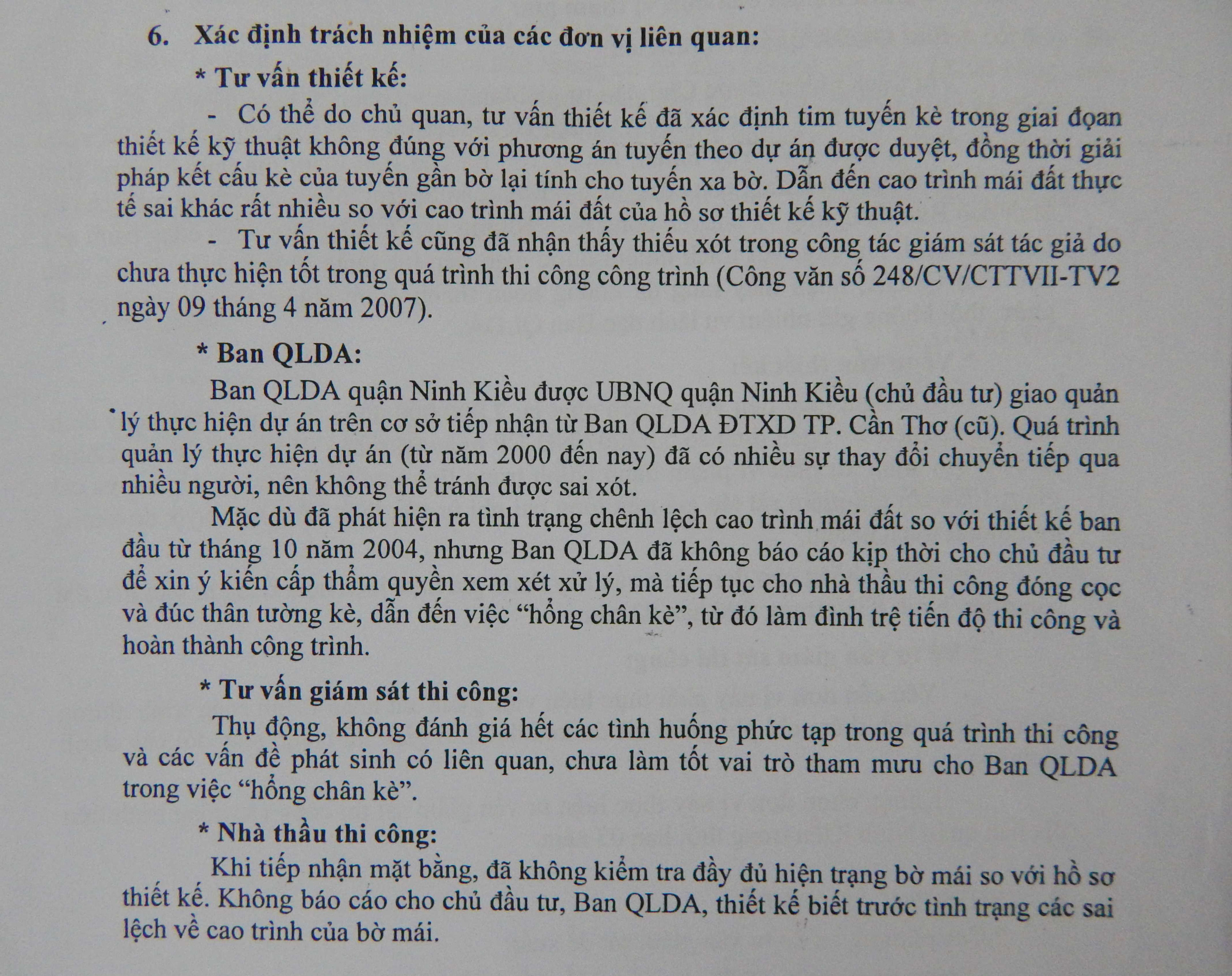 Theo báo cáo 43/BC-BQLDA ngày 24/6/2008 do ông Trần Minh Phát - Quyền Giám đốc Ban QLDA quận Ninh Kiều ký nêu rõ việc sai phạm trong quá trình thực hiện, do không báo cáo kịp thời cho chủ đầu tư (UBND quận Ninh Kiều) để xin ý kiến cấp thẩm quyền xem xét xử lý mà tiếp tục cho nhà thầu thi công dẫn đến việc “hổng chân kè” làm phát sinh kinh phí. Trong báo cáo cũng nêu rõ, trách nhiệm thuộc về lãnh đạo Ban QLDA quận Ninh Kiều. Tuy nhiên, đến nay việc sai phạm trên vẫn chưa được xử lý.