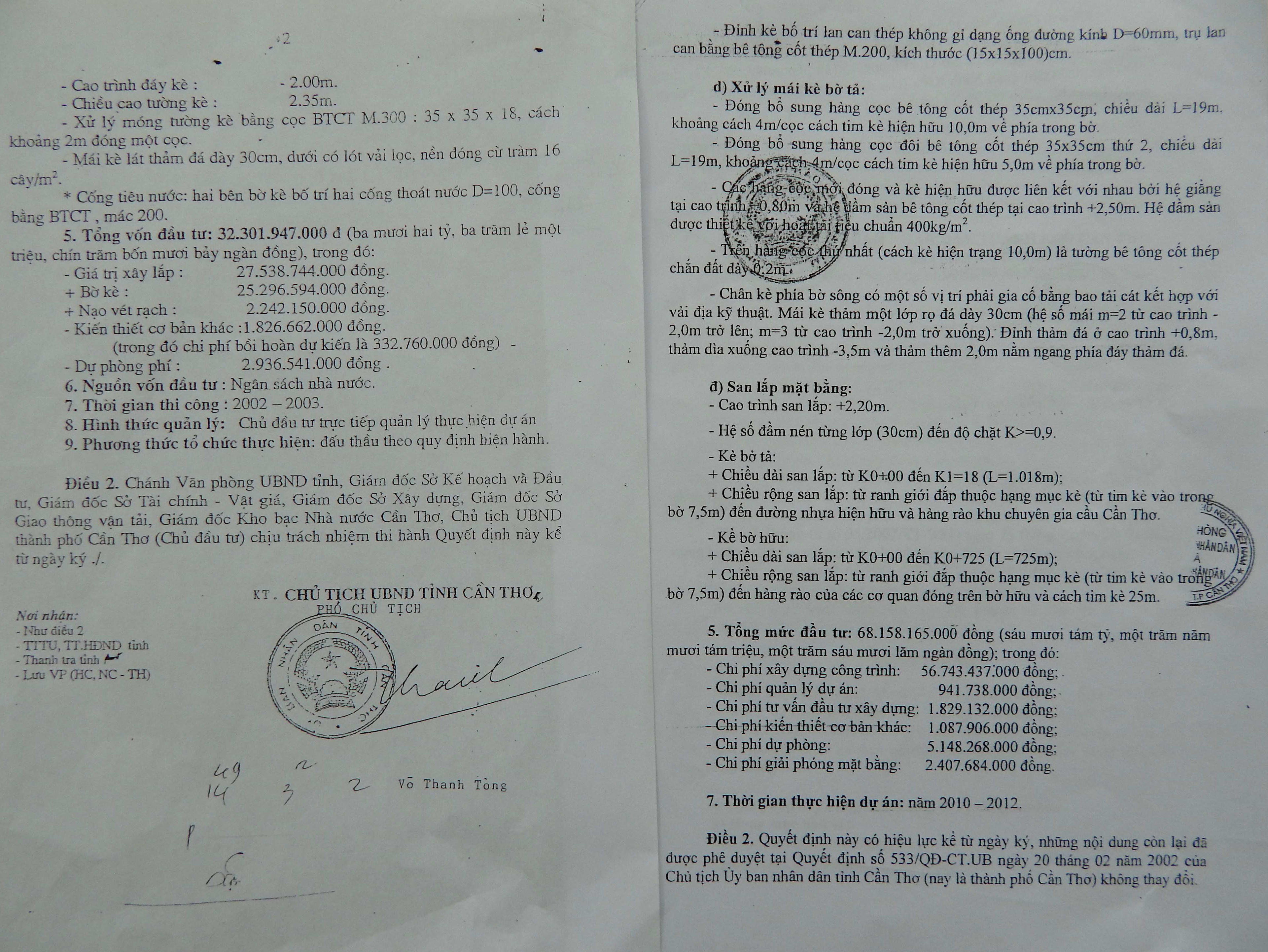 Đến ngày 18/3/2010 UBND TP Cần Thơ ban hành Quyết định số 746/QĐ-UBND điều chỉnh một số điều trong Quyết định số 533/QĐ-CT.UB, theo đó đã phê duyệt tăng tổng mức đầu tư cho dự án lên hơn 68,1 tỷ đồng và kéo dài từ năm 2002 đến năm 2012.