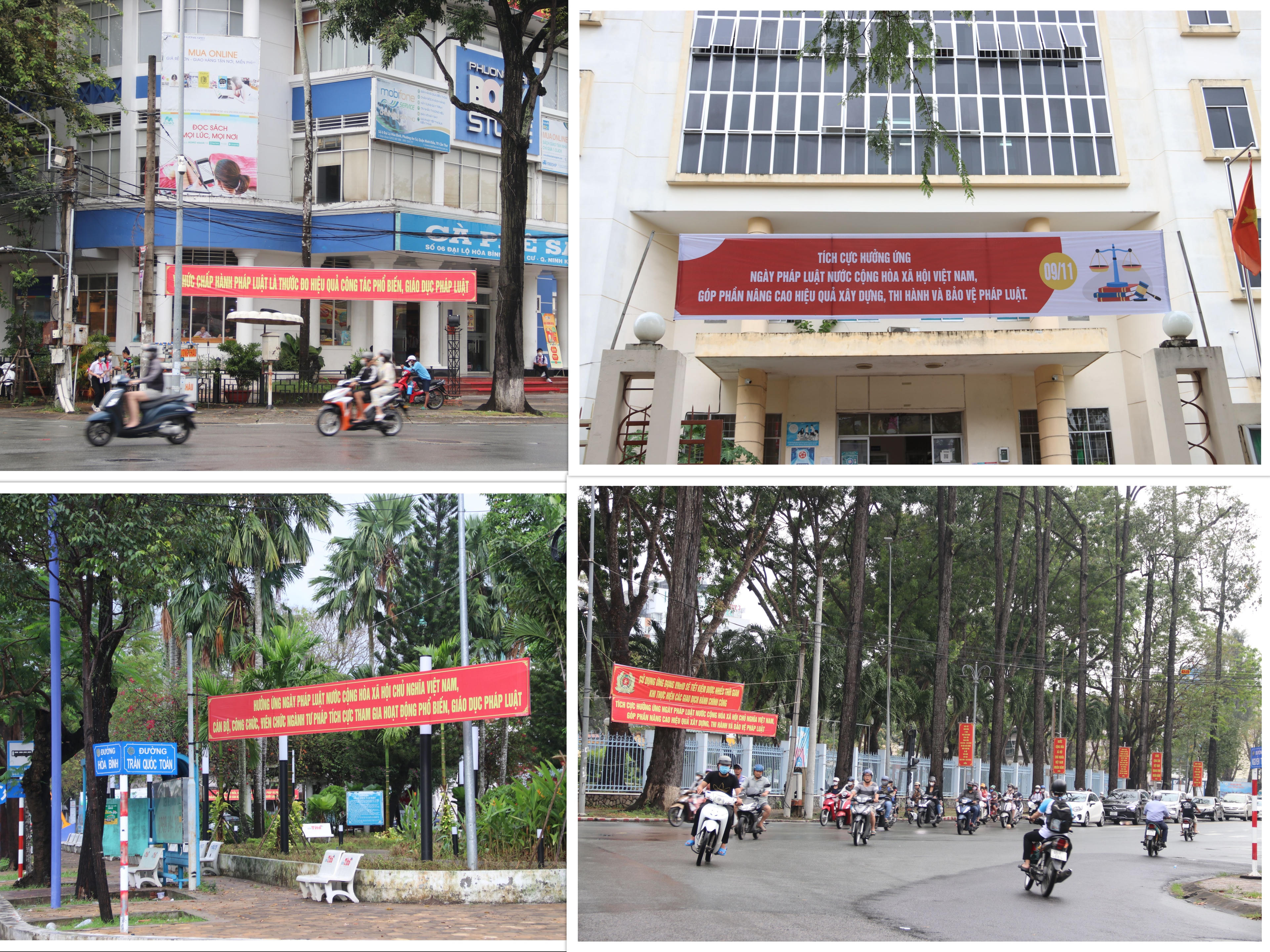 Đồng thời, phối hợp tổ chức phổ biến, truyền thông rộng rãi về chủ đề, khẩu hiệu, mục đích, ý nghĩa Ngày Pháp luật Việt Nam qua tin nhắn đến các thuê bao di động. Treo băng rôn, pano, áp phích, khẩu hiệu tuyên truyền… về Ngày Pháp luật Việt Nam tại trụ sở cơ quan, đơn vị, trường học, các tuyến đường trung tâm từng địa bàn.