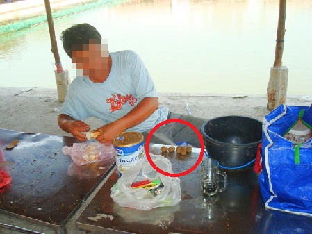 Ngoài ra, bên trong những viên thức ăn tự chế biến làm mồi còn xót lại trên mặt đất, toàn chất dầu cù là loại sáp và được gắn sẵn vào các lưỡi câu chùm nho (chùm lưỡi gồm 5 móc câu kết lại như chùm nho – PV). Chùm mồi này được gắn vào dây cước cần câu, sau khi tung mồi câu cá, thức ăn sẽ bay ra xa đến giữa hồ.