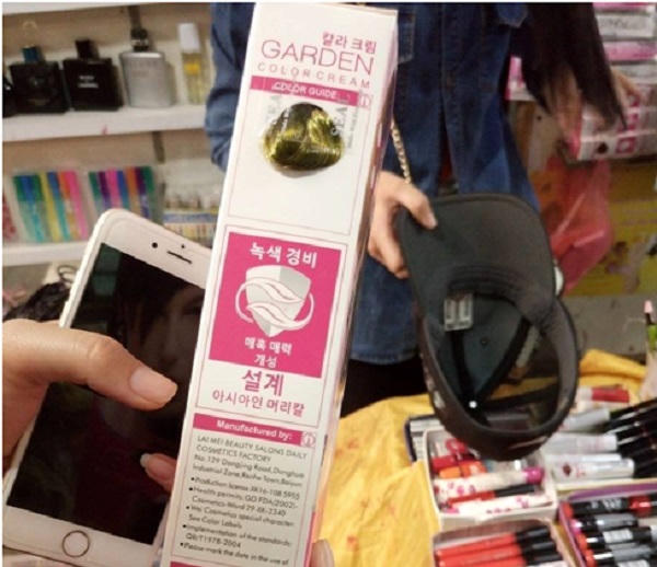 Với giá thành 60.000 đồng/hộp, chủ quầy hàng này khẳng định “chắc như đinh đóng cột” rằng đây là sản phẩm có xuất xứ từ Hàn Quốc, không độc hại, không gây rụng tóc, lên màu y hình. Người này còn cho biết thêm đây là sản phẩm được rất nhiều sinh viên khu vực quanh đây sử dụng. Tuy nhiên, thông tin trên vỏ hộp thuốc nhuộm tóc thì lại không hề giống như những gì mà chủ quầy quảng cáo.