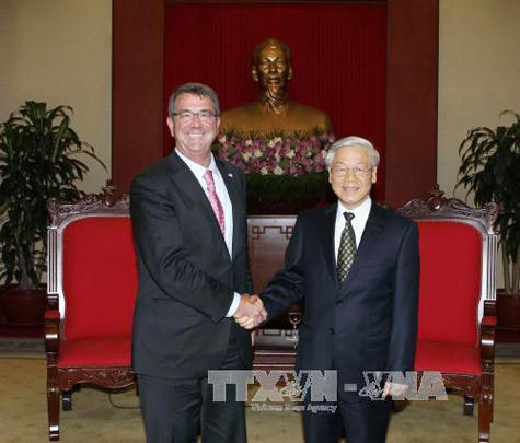 Báo điện tử Chính phủ đưa tin, hoan nghênh Bộ trưởng Quốc phòng Ashton Carter thăm Việt Nam, Tổng Bí thư khẳng định chủ trương nhất quán của Đảng và Nhà nước Việt Nam coi trọng thúc đẩy quan hệ Việt Nam - Hoa Kỳ, vì lợi ích lâu dài của nhân dân hai nước, vì hòa bình, ổn định, phát triển trong khu vực và trên thế giới.