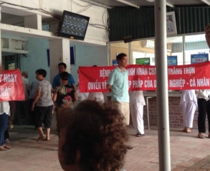 Khoảng 9h30 sáng nay (01/08), có gần chục người mặc áo blue đã căng băng rôn đứng trước điểm khám bệnh của bệnh viện Thanh Nhàn để đòi quyền lợi. Trên các băng rôn này ghi: “yêu cầu bệnh viện Thanh Nhàn khẩn cấp đối thoại, chấm dứt hành vi vi phạm nghiêm trọng pháp luật, chà đạp trắng trợn quyền và lợi ích của doanh nghiệp”…