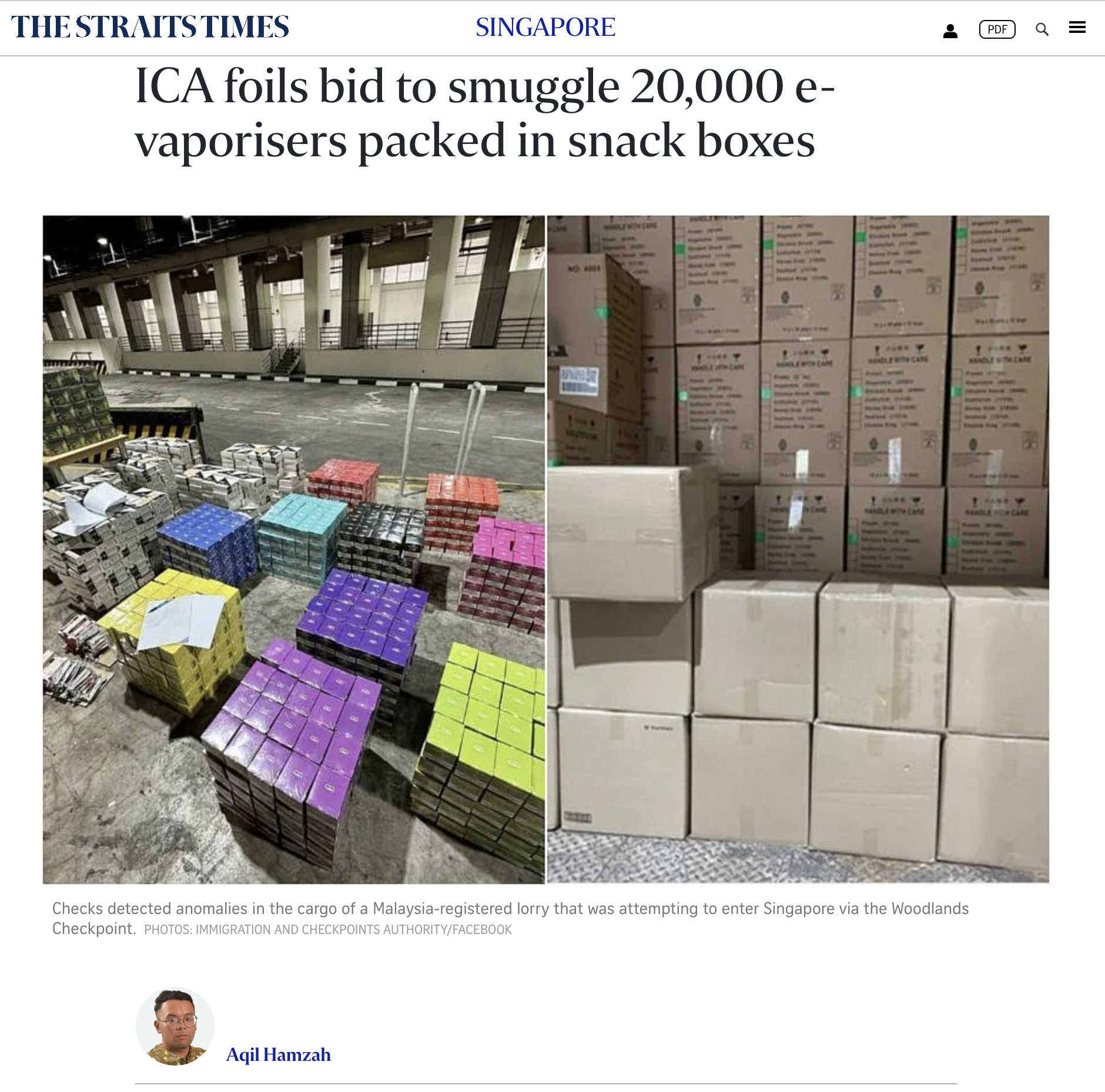 Chưa dừng lại ở đó, tháng 2/2023, cán bộ Cục Quản lý Xuất nhập cư Singapore (ICA) đã bắt giữ được lô hàng nhập lậu hàng chục nghìn sản phẩm TLĐT. Dù nhận thức rõ khung hình phạt khắc nghiệt lên tới 10.000 đô la Singapore (gần 200 triệu đồng Việt Nam) và 6 tháng tù giam, những kẻ chủ mưu vụ buôn lậu vẫn chấp nhận đánh đổi vì lợi nhuận vô cùng lớn.