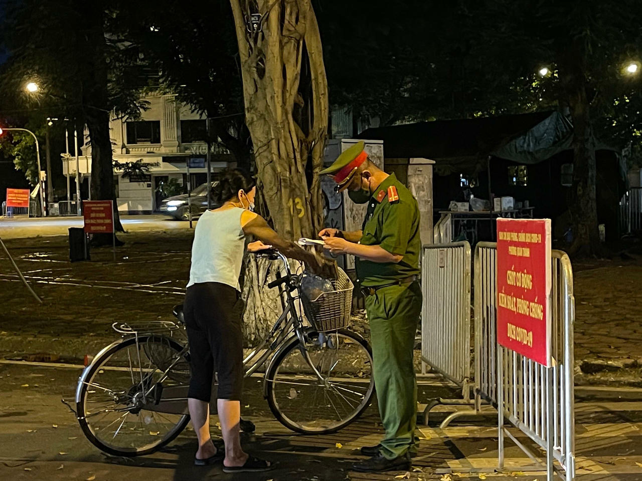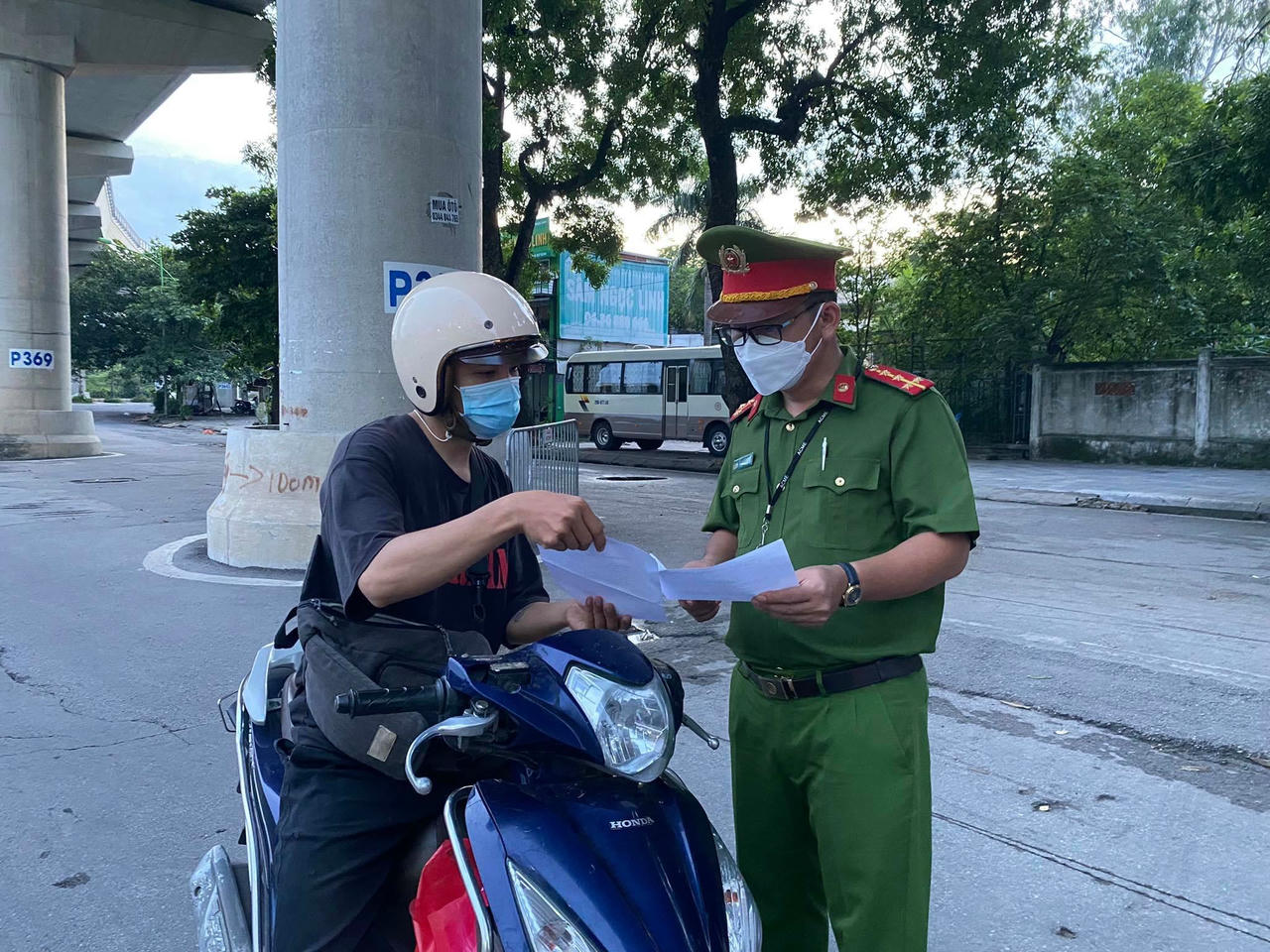 Cán bộ kiểm tra giấy đi đường của người dân tại chốt trên đường Kim Mã. |
