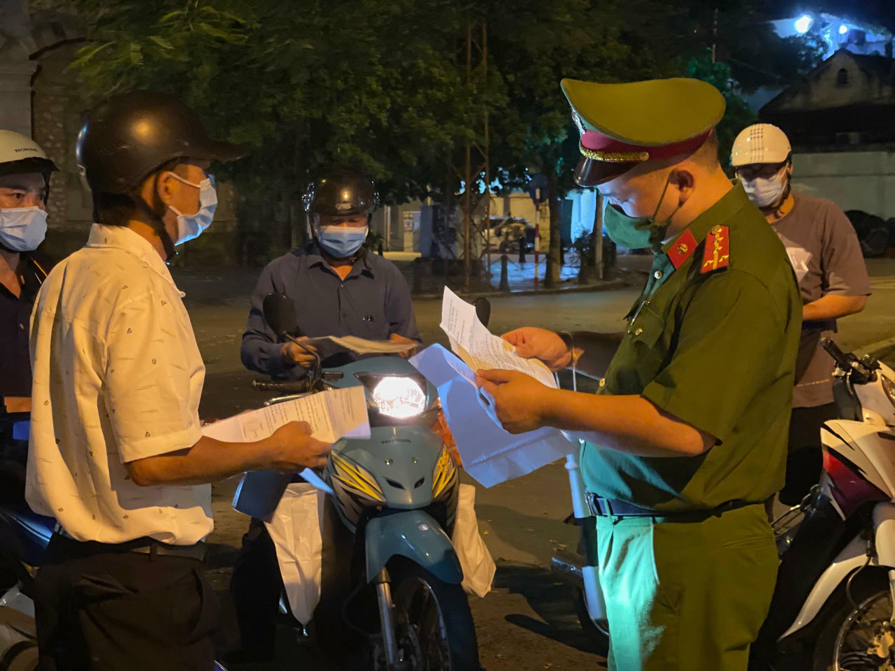 | Lực lượng chức năng kiểm tra giấy đi đường của người dân, kiên quyết xử lý trường hợp vi phạm. |