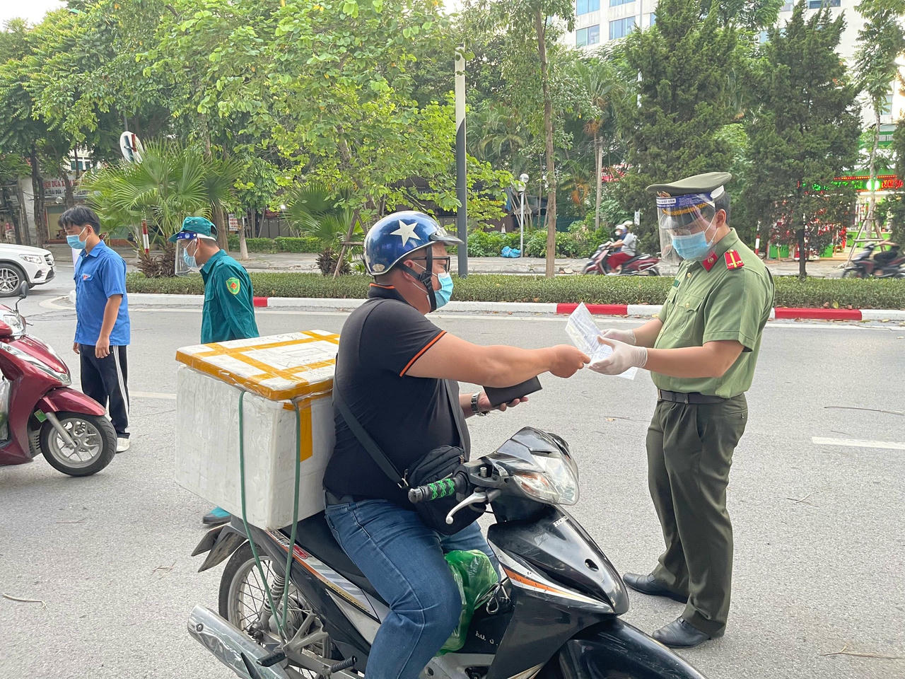 Lực lượng chức năng kiểm tra giấy đi đường của người dân tại chốt trên đường Quán Thánh - Bốt Hàng Đậu. |