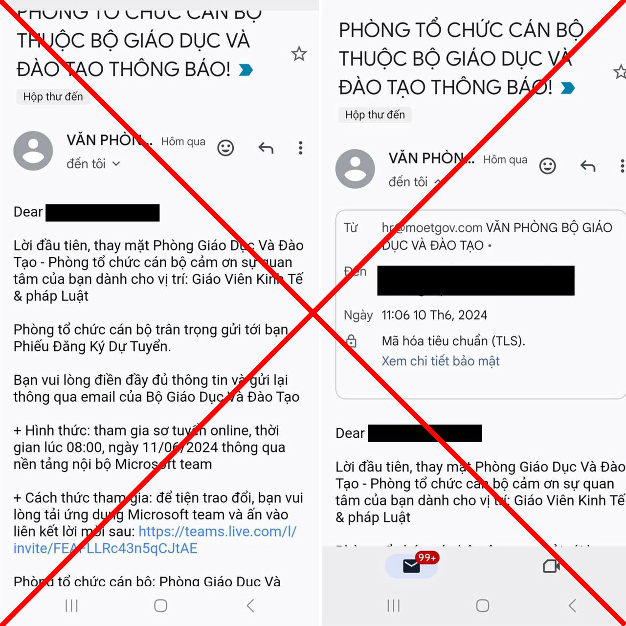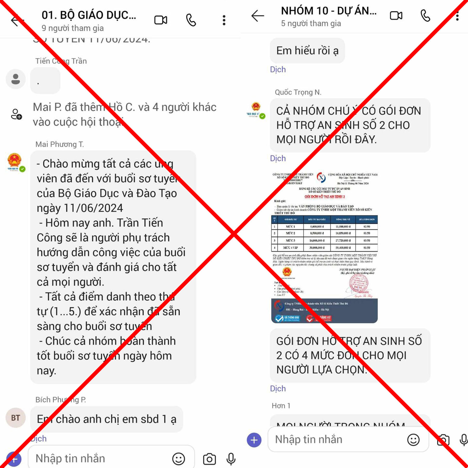 "Tuyệt đối không nghe theo, không liên hệ với các website, fanpage, tài khoản mạng xã hội quảng cáo dịch vụ “tiếp nhận hồ sơ Hiệu Trưởng/Phó Hiệu Trưởng, Thủ Quỹ ”; "Đóng góp quỹ an sinh cho trẻ em vùng cao"... trên không gian mạng. Không chuyển tiền cho các đối tượng trên để được hướng dẫn, tiếp nhận, hoàn thiện hồ sơ", Bộ GD&ĐT khuyến cáo.