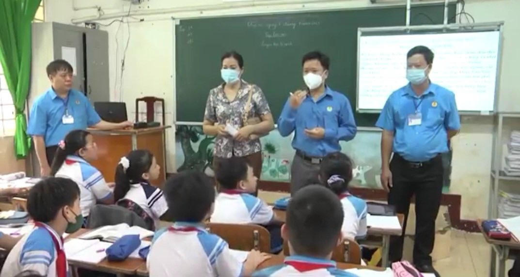 Cán bộ Trung tâm y tế TP Đồng Xoài tới trường kiểm tra và hướng dẫn cô trò phòng chống dịch đau mắt đỏ. |