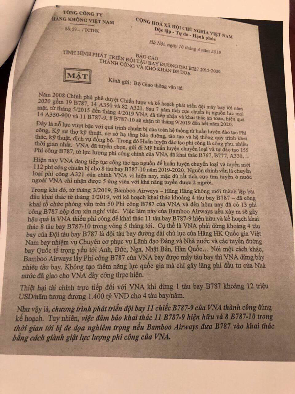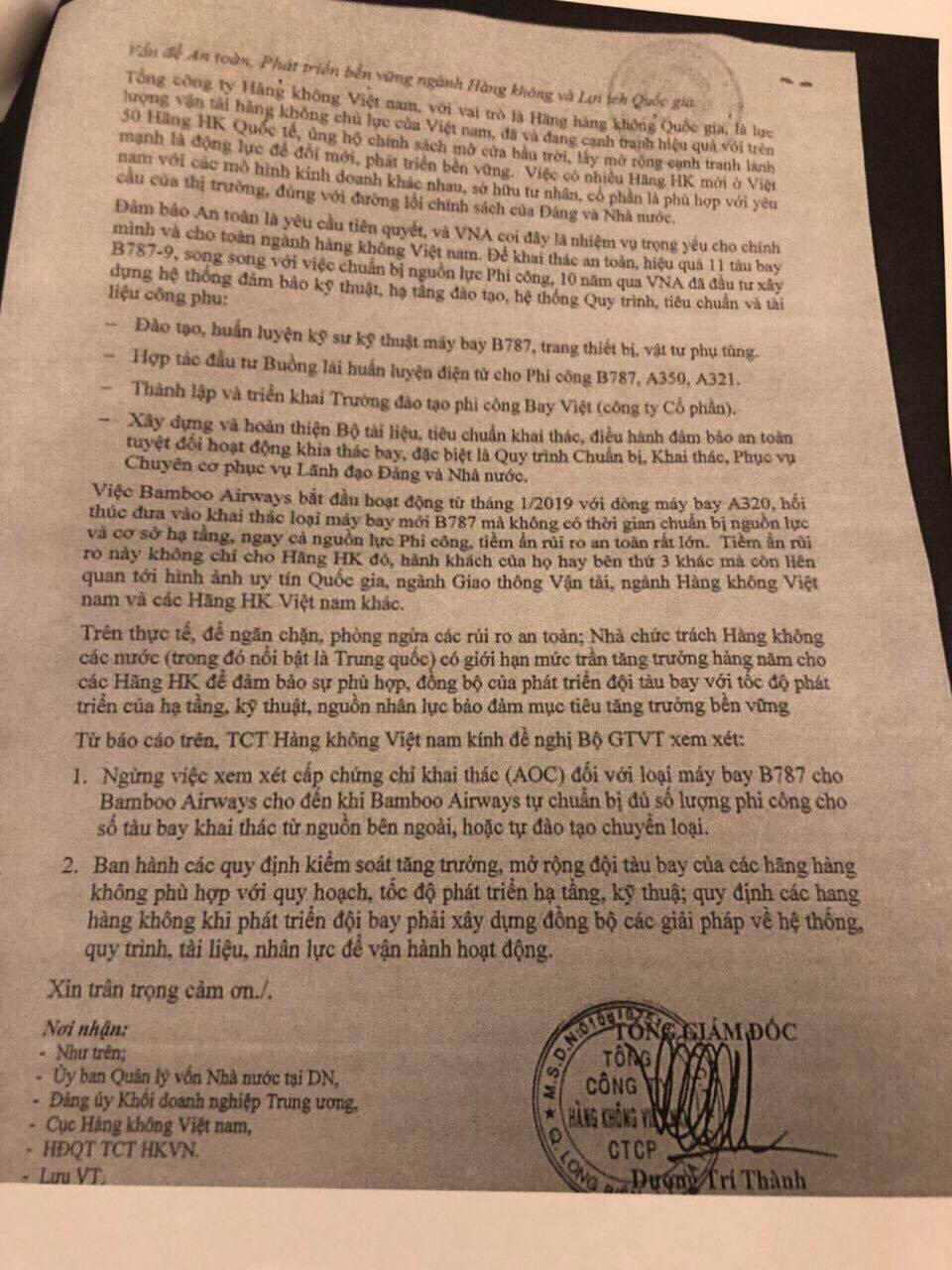 Nội dung văn bản này phản ánh về việc Bamboo Airways có hành vi “giành giật lực lượng phi công của VNA”. Đáng chú ý, văn bản này còn trực tiếp đề nghị Bộ GTVT dừng xem xét việc cấp chứng chỉ khai thác (AOC) đối với loại tàu bay thân rộng B787 mà Bamboo Airways đang chuẩn bị đưa vào khai thác.