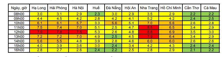Cụ thể giá trị cao nhất xảy ra trong khoảng 12h, riêng Nha Trang là từ 11h-13h. Tại các thành phố Đà Nẵng, TP Hồ Chí Minh chỉ số tia UV đều đạt mức cao. Tại Huế, Hội An, Cần Thơ và Cà Mau có chỉ số UV cao nhất trong ngày ở mức trung bình.