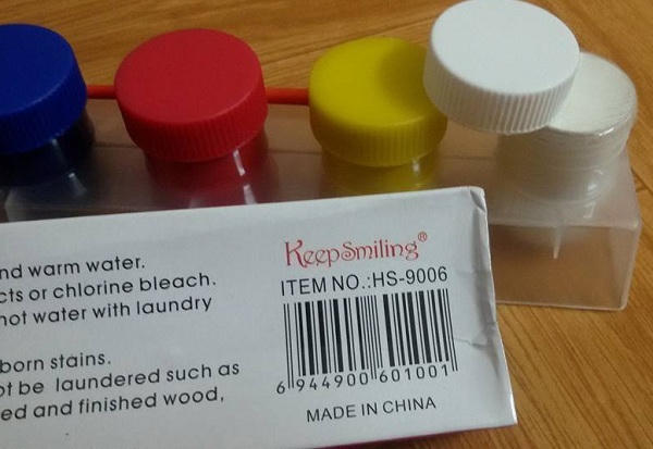 Ông chủ cửa hàng tư vấn: “Mua cho trẻ tập vẽ thì nên lấy loại 6 – 12 lọ nhỏ/ bộ, vừa rẻ, vừa nhiều màu, bé tha hồ vẽ, không sợ tốn”. Khi được hỏi về nguồn gốc xuất xứ, người bán giới thiệu các loại màu vẽ này có xuất xứ từ Pháp, một số là hàng Việt Nam. Nhưng khi chọn một bộ màu bất kì, kiểm tra thấy trên bao bì lại in dòng chữ “Made in China”.