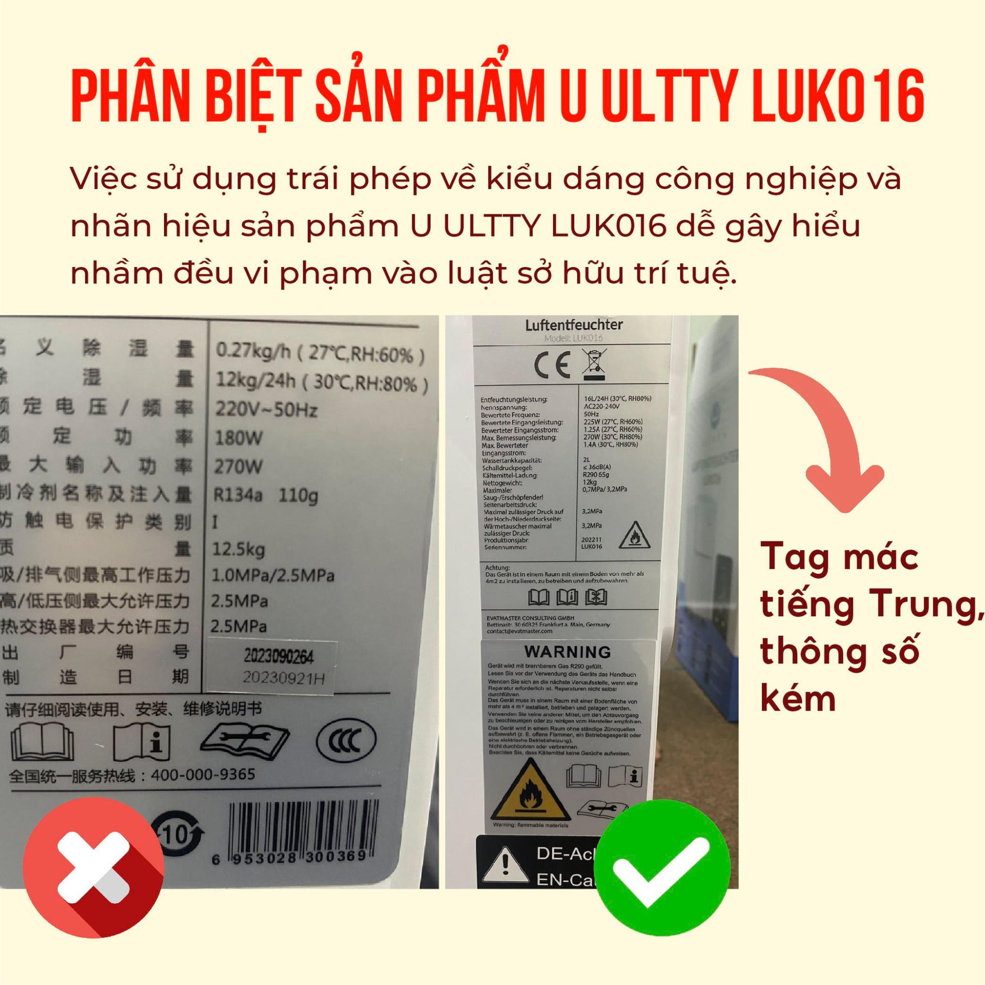 Hàng giá - hàng nhái có tem mác tiếng Trung, các chỉ số thông số kém hơn. Không đảm bảo tiêu chuẩn và an toàn chất lượng sản phẩm. Trong khi đó sản phẩm máy hút ẩm ULTTY LUK016 có tem mác thông số rõ rang, các tiêu chuẩn về an toàn điện CE,…
