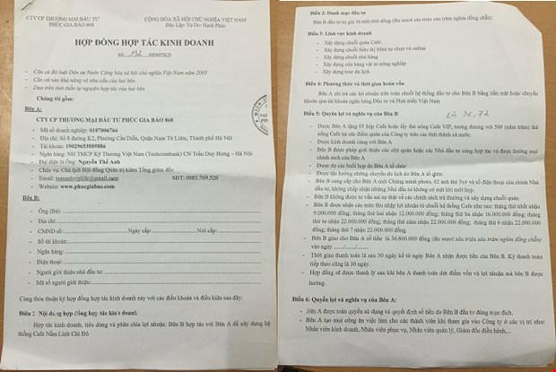 Hợp đồng, Hợp tác, Kinh doanh - đó là chiêu thức mà Công ty Cổ phần Đầu tư Thương mại Phúc Gia Bảo 68 mời chào các nhà đầu tư. Nội dung ghi trong hợp đồng là hợp tác để xây dựng hệ thống Cà phê Nấm Linh Chi đỏ, nhà hàng và siêu thị.