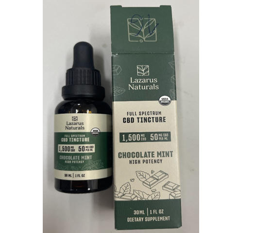 Thứ hai là mẫu dung dịch màu nâu bên trong chai thủy tinh màu nâu có nắp nhựa màu đen có nhãn hiệu “Lazarus Naturals Full Spectrum CBD TINCTURE 1500mg CBD 50 mg CBD per ml” đựng hộp giấy hình chữ nhật trên hộp có nhãn hiệu “Lazarus Naturals Full Spectrum CBD TINCTURE 1500mg CBD 50 mg CBD per ml” loại 30ml có ma túy loại Delta-9-tetrahydrocanabinol, thể tích 30ml.