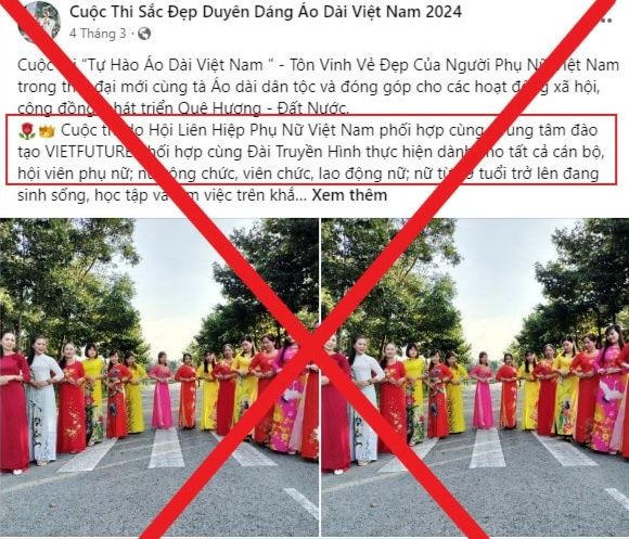 Cũng liên quan đến việc mạo danh lừa đảo trên không gian mạng. Hội LHPN Việt Nam còn cho biết, một số đối tượng mạo danh thành lập các fanpage facebook có tên như: Lễ hội áo dài thành phố Hồ Chí Minh 2024; Áo dài thanh lịch 2024; Duyên dáng áo dài Việt Nam... và lấy danh nghĩa Hội LHPN Việt Nam, Đài truyền hình Việt Nam và một số đơn vị để quảng cáo tổ chức các cuộc thi về áo dài Việt Nam nhằm mục đích lừa đảo, chiếm đoạt tài sản đối với những người đăng ký tham gia cuộc thi.
