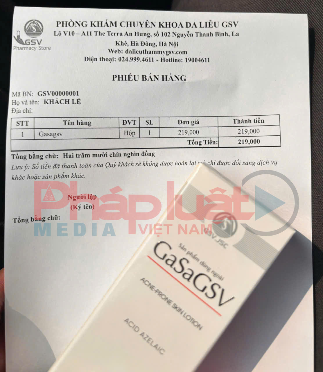 Thời gian qua, Báo PLVN nhận được nhiều phản hồi của người tiêu dùng, đã từng là khách hàng của GSV về việc mua phải sản phẩm dược mỹ phẩm không đảm bảo chất lượng, sản phẩm hỏng, sau khi sử dụng đã gây ảnh hưởng xấu tới da mặt, cụ thể sản phẩm Gasa GSV có số lô sản xuất: 052023, mã hồ sơ: 000.00.19.H26-221221-0015; số công bố: 220003453/PCBA-HN; ngày công bố: 23/12/2022; tên thiết bị y tế: Sản phẩm dùng ngoài. Ngày sản xuất 04/05/2023. HSD: 03/05/2026.