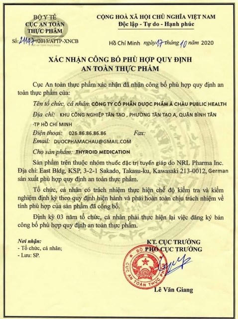Trên cơ sở công văn trả lời của Cơ quan cảnh sát điều tra Công an Quận Tân Bình - TP HCM, Cục An toàn thực phẩm cảnh báo về việc Giấy xác nhận công bố phù hợp quy định an toàn thực phẩm của sản phẩm Thyroid Medication nêu trên là giả mạo.