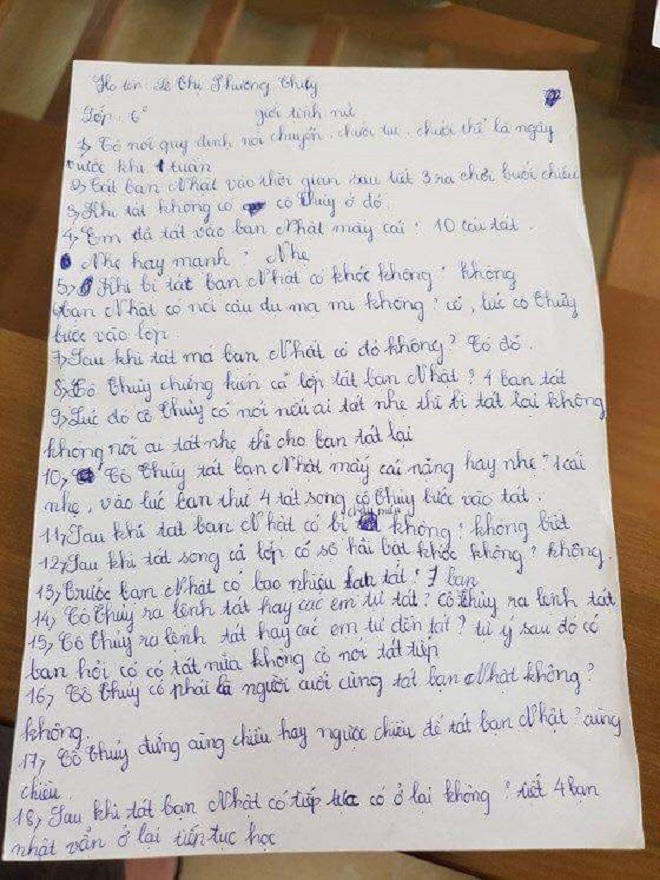 Mà thực tế, dư luận cho rằng, bà đang lo chiếc ghế Hiệu trưởng của mình bị lung lay. Bắt 23 học sinh ghi rõ giới tính, phải trả lời đủ 19 câu hỏi “điều tra”, yêu cầu các em phân loại ra bao nhiêu cái tát mạnh, tát nhẹ, tát vừa... cuối cùng là ký tên cam đoan. Bà biến học trò của mình như những tên tội phạm bị hỏi cung!