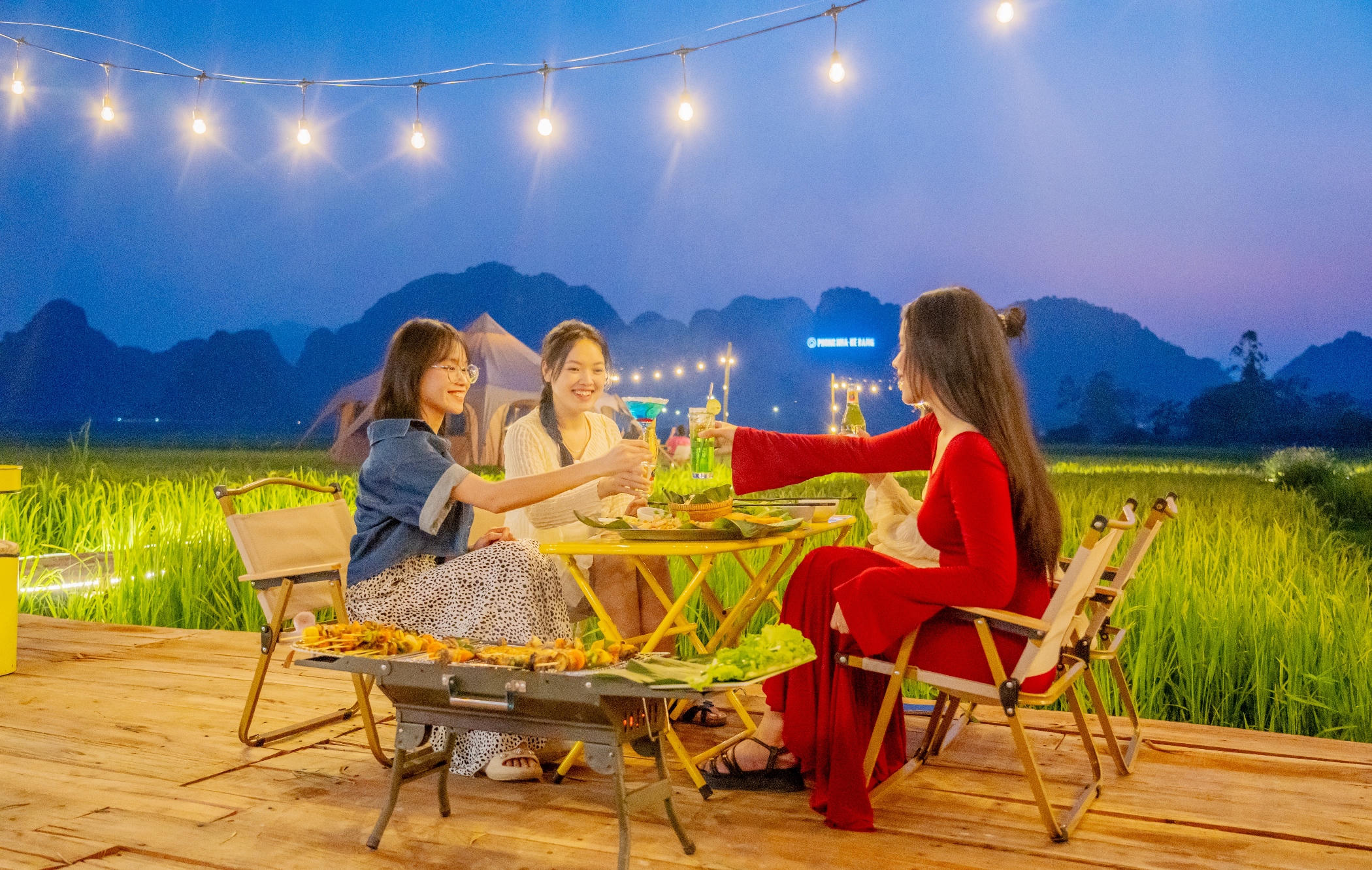 Tiệc BBQ buổi tối giữa mênh mang hương đồng gió nội làng quê yên bình. |
