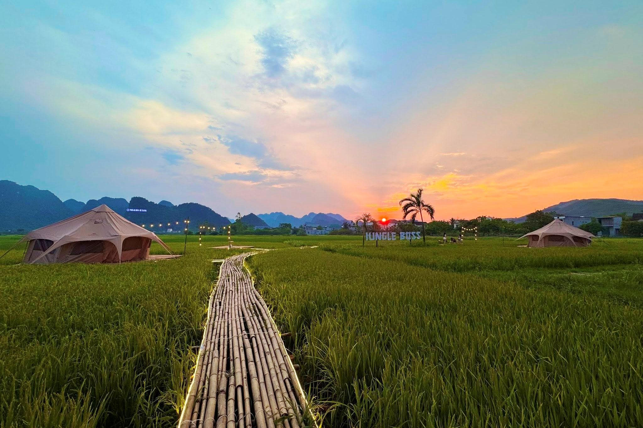 Mùa này, ở khu cắm trại nhìn ra bao la là cả cánh đồng lúa mướt xanh đang thì trổ bông. Xa xa là cánh rừng Di sản thiên nhiên thế giới – Vườn quốc gia Phong Nha - Kẻ Bàng với những ngọn núi đá vôi ngang tầm mây trắng. Đến với Jungle Boss Travelodge, du khách sẽ có cảm nhận phố thị xô bồ náo nhiệt thường ngày dường như đã bị bỏ lại phía sau.