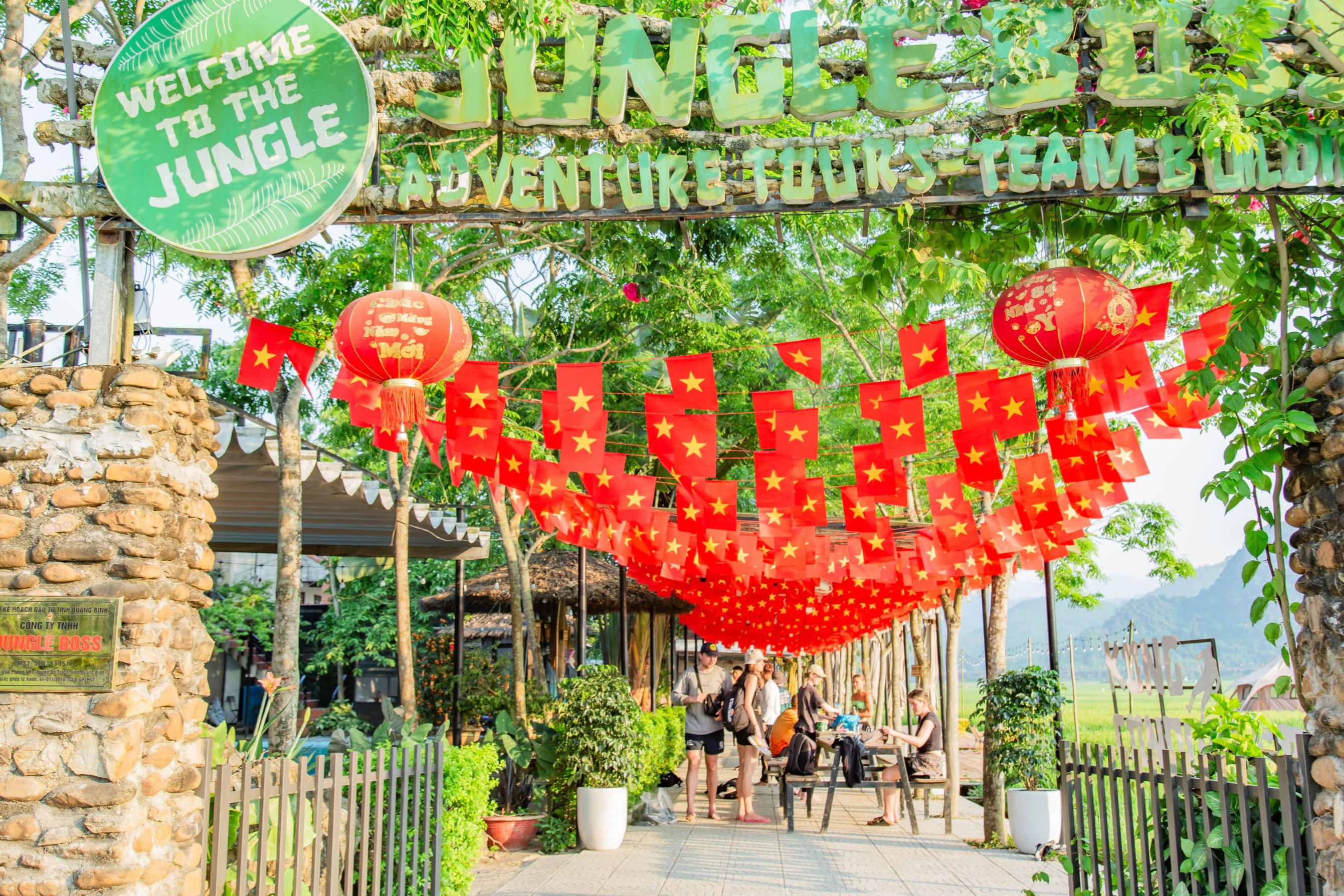 Cổng vào khu cắm trại Jungle Boss Travelodge được trang trí rợp cờ Tổ quốc từ dịp lễ 30/4. |