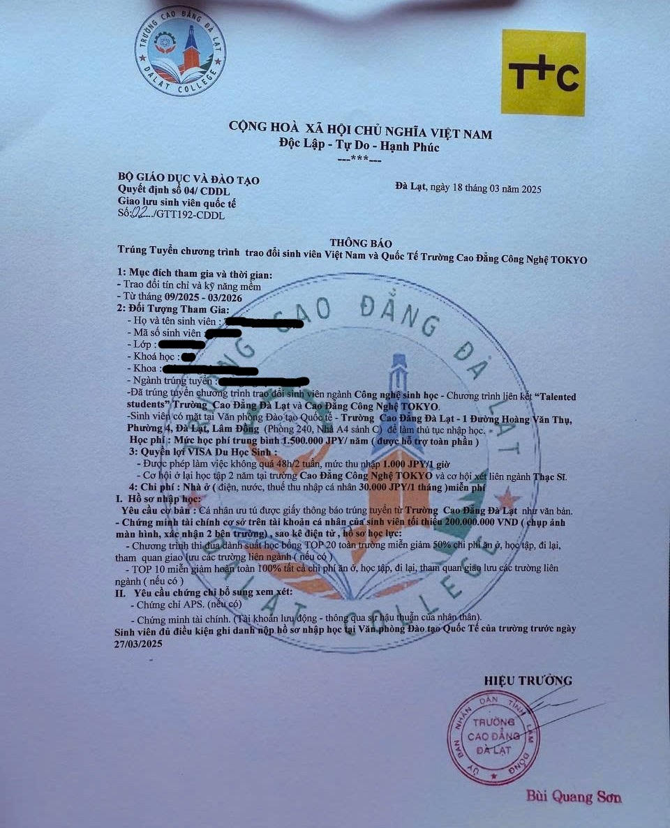 Ngày 23/4, Công an tỉnh Lâm Đồng thông tin, vừa qua, em T.T.N.N – sinh viên của trường Cao đẳng Đà Lạt nhận được 01 file hình ảnh Thông báo Trúng tuyển chương trình trao đổi sinh viên Việt Nam và Quốc tế Trường Cao đẳng Công nghệ TOKYO từ 01 tài khoản Zalo lạ.