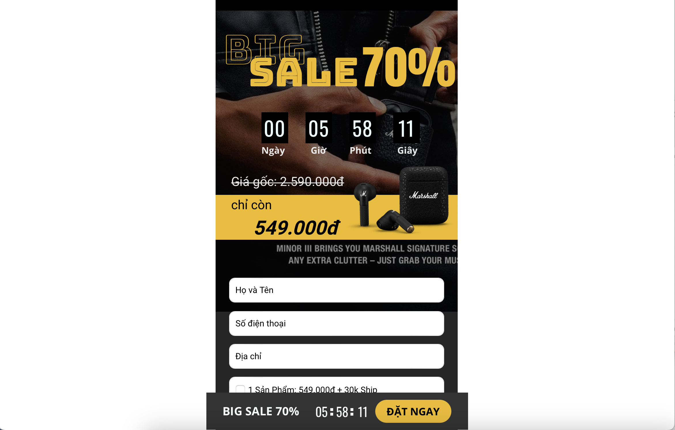 Tất cả các bài quảng cáo đều có đường link dẫn về các trang bán hàng khác nhau, tuy nhiên đều có chung một giao diện là hình ảnh của chiếc tai nghe Marshall Minor 3 với mức giá giảm sốc và có nút đặt hàng kèm số lượng và thời gian đều sắp hết để người mua có thể đặt ngay, như một hoạt động săn hàng giá sốc nhằm gây tò mò và kích thích người tiêu dùng phải đặt hàng ngay nếu không sẽ bị lỡ cơ hội săn sale "hàng hiệu giá rẻ".