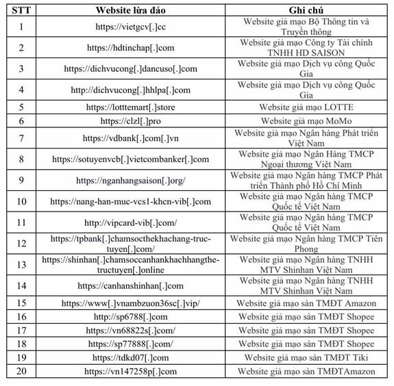 Một số website lừa đảo theo khuyến cáo của Cục An toàn thông tin, Bộ TTTT |
