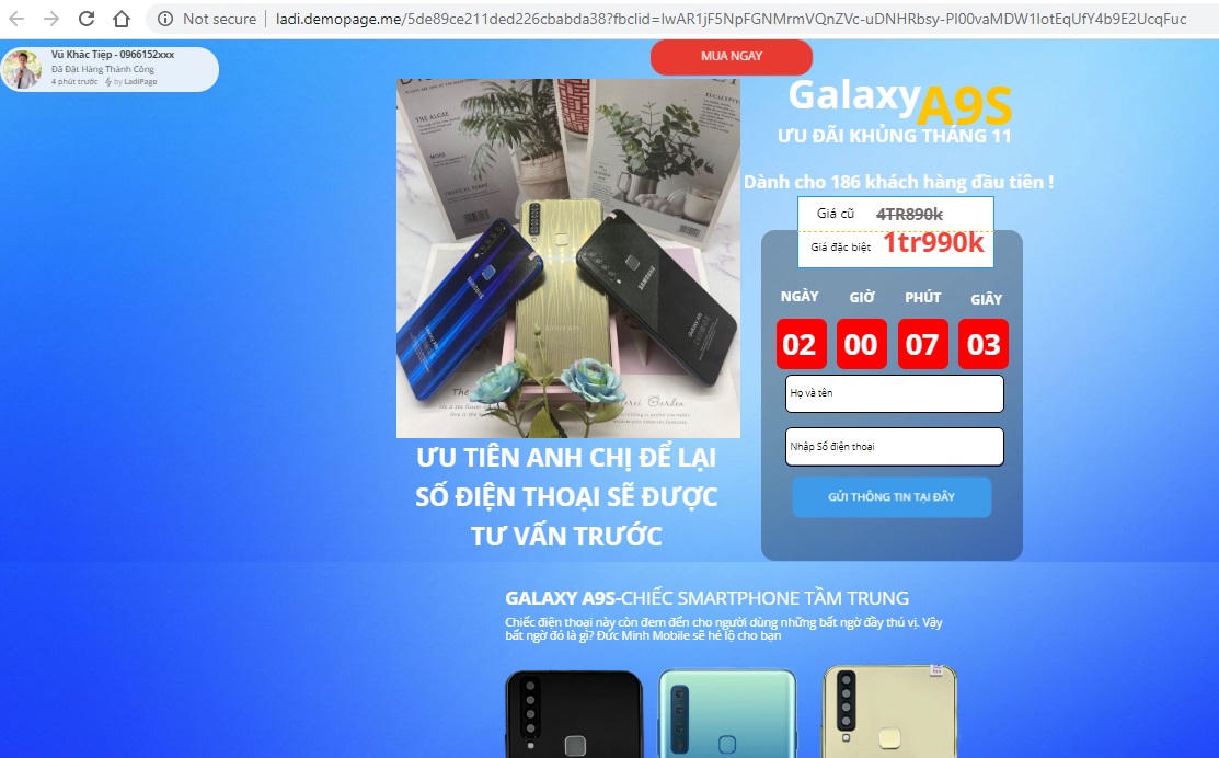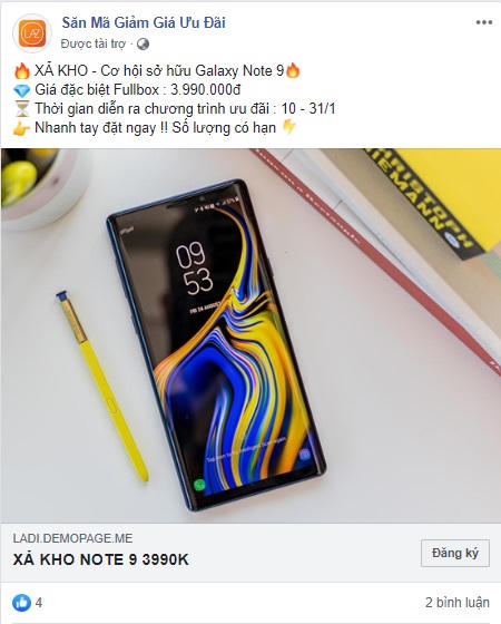 Từ tháng 3/2019, trên mạng xã hội Facebook liên tục xuất hiện các fanpage bán hàng, chào giá chiếc điện thoại cao cấp Samsung Note 9 chỉ 4,5 triệu đồng. Người dùng Facebook chỉ cần một lần bấm vào các đường dẫn về các quảng cáo “hấp dẫn” đó thì sẽ được chuyển hướng đến một website khác của đơn vị bán hàng. Các website này thường là các trang quảng cáo do các đơn vị bán hàng tự lập trên nền tảng Landing Page - tức là trang đích (trang mục tiêu). Và mục tiêu chính của nó là thu hút lượt xem, lượt click, hay kích thích hành vi mua hàng của người dùng thông qua các tác vụ kêu gọi xuất hiện trong đó như điền thông tin cá nhân, số điện thoại để đăng ký nhận thông tin và mua hàng...