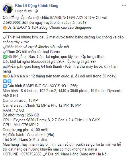 Để tìm hiểu về những siêu phẩm smartphone được bán với giá “sập sàn” này, phóng viên đã thử bấm vào một mẩu quảng cáo trên mạng xã hội Facebook về một sản phẩm Samsung Galaxy Note 10+ với lời quảng cáo là “sản phẩm Sale off 40% và nhập khẩu Singapore. Sản phẩm này được bán với giá là 2.790.000 đồng (tương đương 10% so với giá bán của sản phẩm này là khoảng 26 triệu đồng) với cam kết bảo hành 12 tháng trên toàn quốc, đổi trả trong vòng 30 ngày nếu có lỗi...