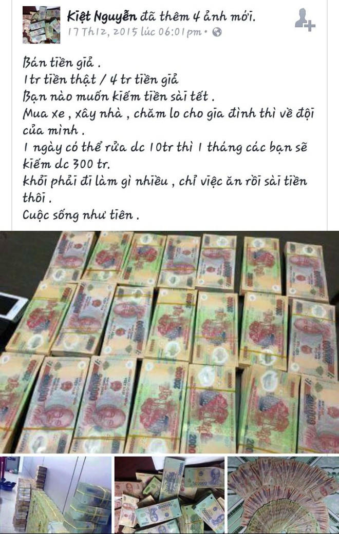 Tiền giả hiện đang trở thành món hàng được rao bán công khai trên mạng xã hội. Hàng chục tài khoản bán với rao hấp dẫn, 1 triệu tiền thật được 4 triệu tiền giả, hay 1 triệu tiền thật được 7 triệu tiền giả. Chất lượng 95% giống tiền thật, nhìn bề ngoài rất khó phát hiện trừ khi dùng máy soi; kèm theo đó là những hình ảnh về các cọc tiền mệnh giá từ 50.000 đồng đến 500.000 đồng.