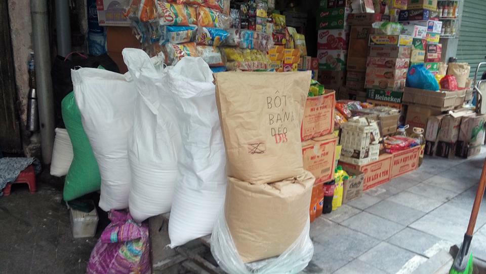 Theo quan sát, hai loại bột mì và bột nếp ở cửa hàng cô Hà được đựng trong những bao tải lớn, loại 10kg/bao, nhưng không được đóng gói cẩn thận và cũng không hề có bất kỳ thông tin nào về sản phẩm, ngoại trừ dòng chữ “Bột bánh dẻo” mà chủ cửa hàng ghi bên ngoài bao để nhận biết.