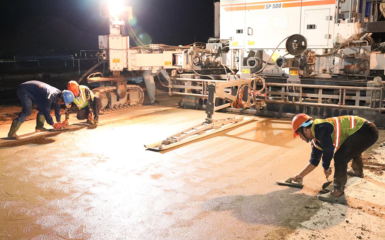 Máy móc cùng công nhân xử lý làm láng mặt bê tông sau khi được đổ. |