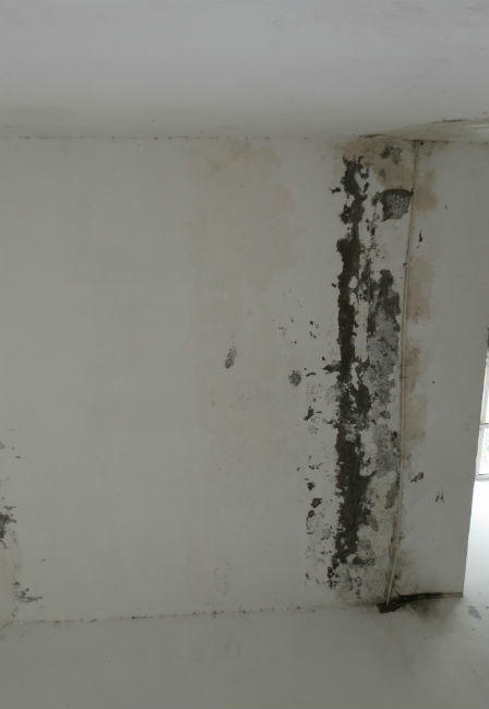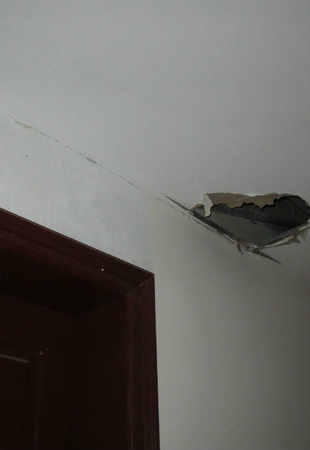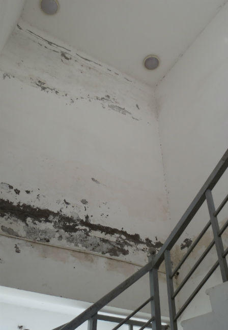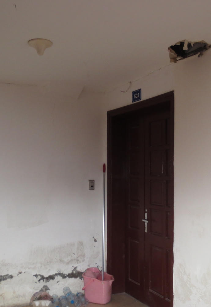 | Cả phía ngoài và bên trong tường của tòa nhà đều xuất hiện nhiều chỗ bong tróc, hư hại nghiêm trọng |