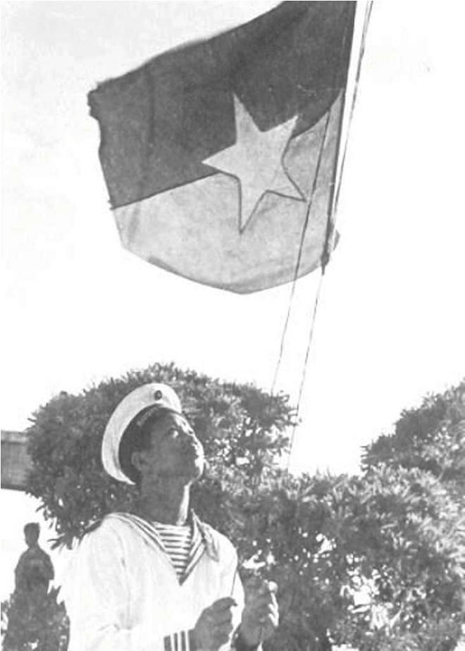 Lá cờ Mặt trận giải phóng miền Nam Việt Nam được chiến sĩ Lê Xuân Phát kéo lên đỉnh cột cờ trước bia chủ quyền, tung bay trên đảo Song Tử Tây. Lúc đó là 5h15 ngày 14/4/1975”, Tướng Năng kể lại.