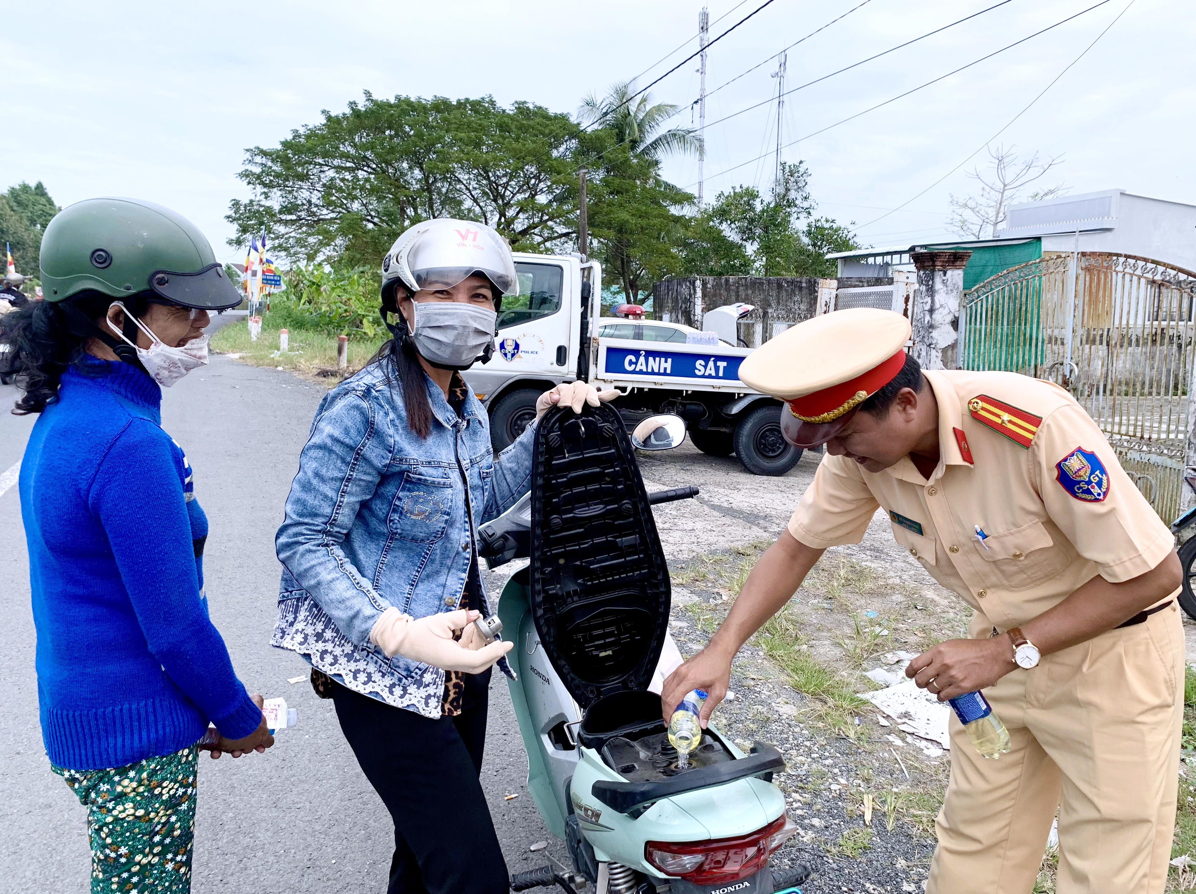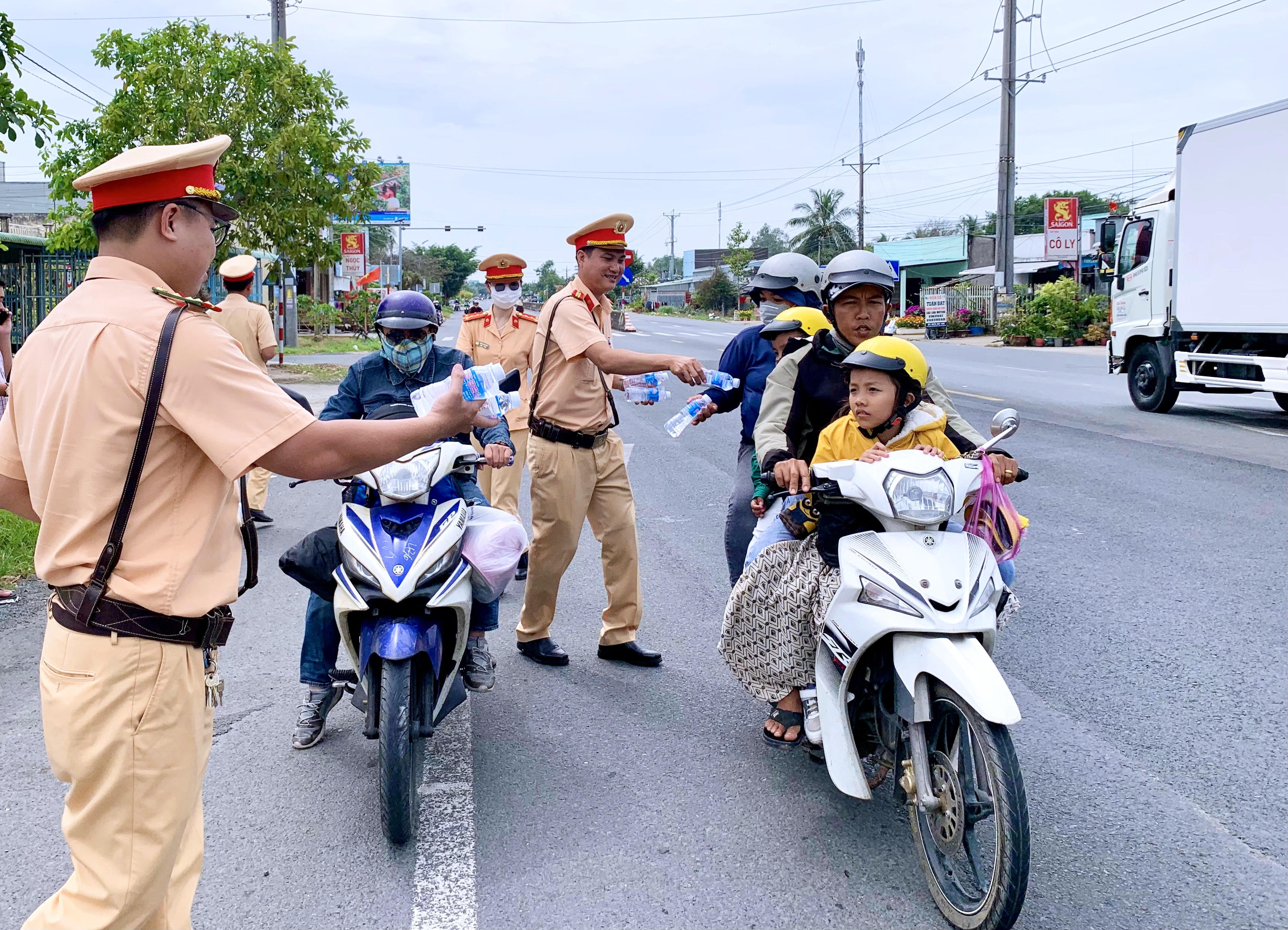 Cảnh sát giao thông Bạc Liêu tặng nước suối, khăn lạnh, xăng miễn phí cho người dân lưu thông