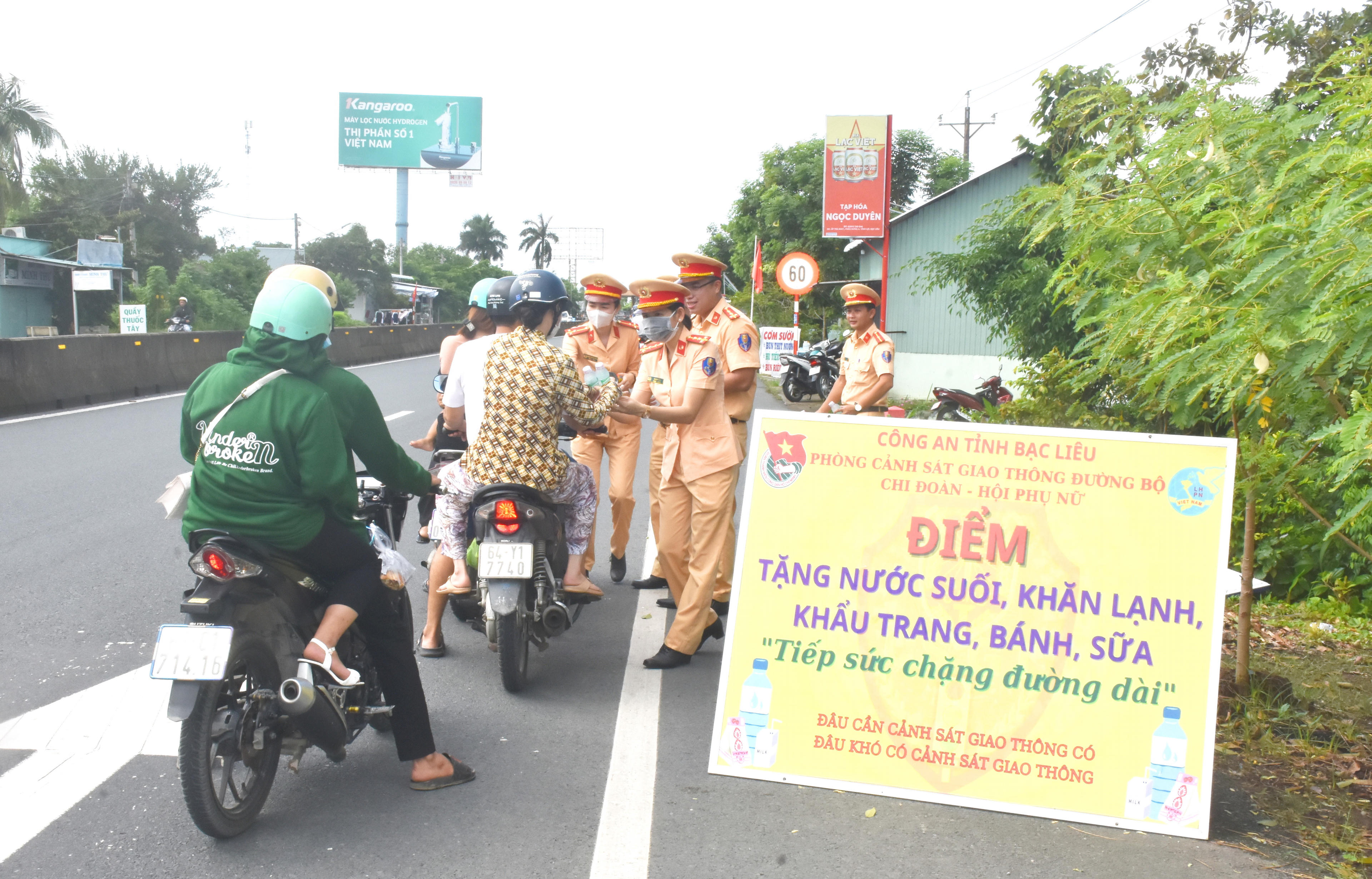 Theo ghi nhận của phóng viên tại tuyến quốc lộ 1A (đoạn qua địa bàn xã Châu Hưng A, huyện Vĩnh Lợi,) lực lượng Cảnh sát giao thông đã đặt các bảng thông báo từ xa với nội dung “Điểm tặng nước suối, khăn lạnh, khẩu trang, bánh, sữa - Tiếp sức chặng đường dài” để người dân dễ nhận biết và dừng phương tiện nhận những phần quà ý nghĩa này.