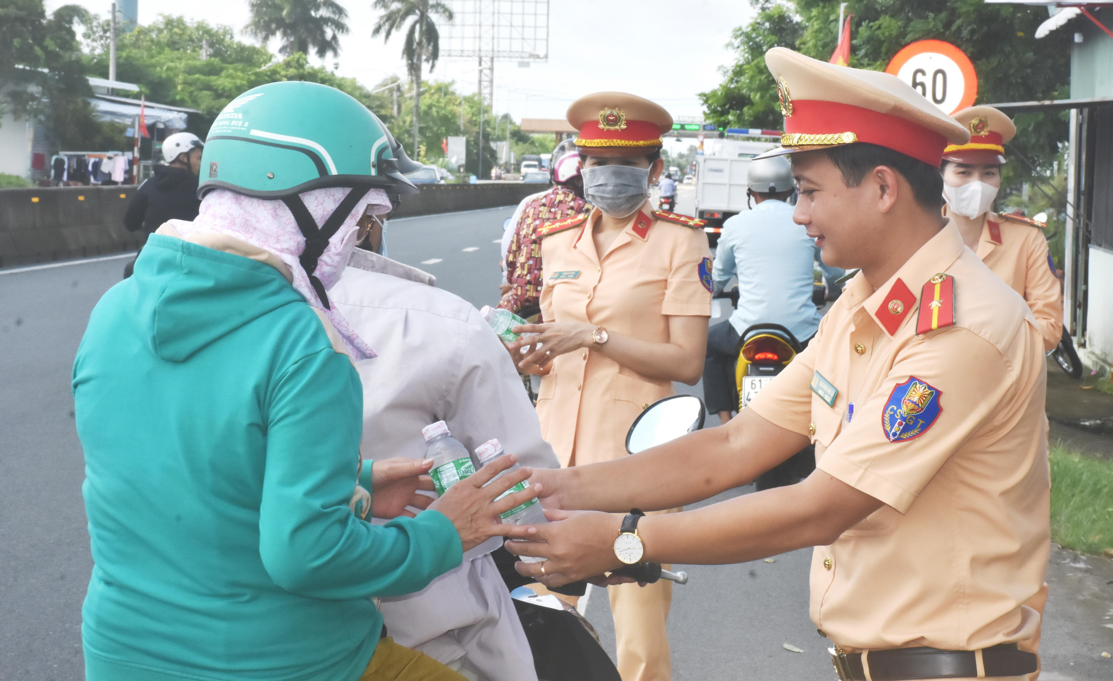 Lực lượng Cảnh sát giao thông đường bộ (Công an tỉnh Bạc Liêu) trao tận tay đến người dân những chai nước suối, khăn lạnh. |